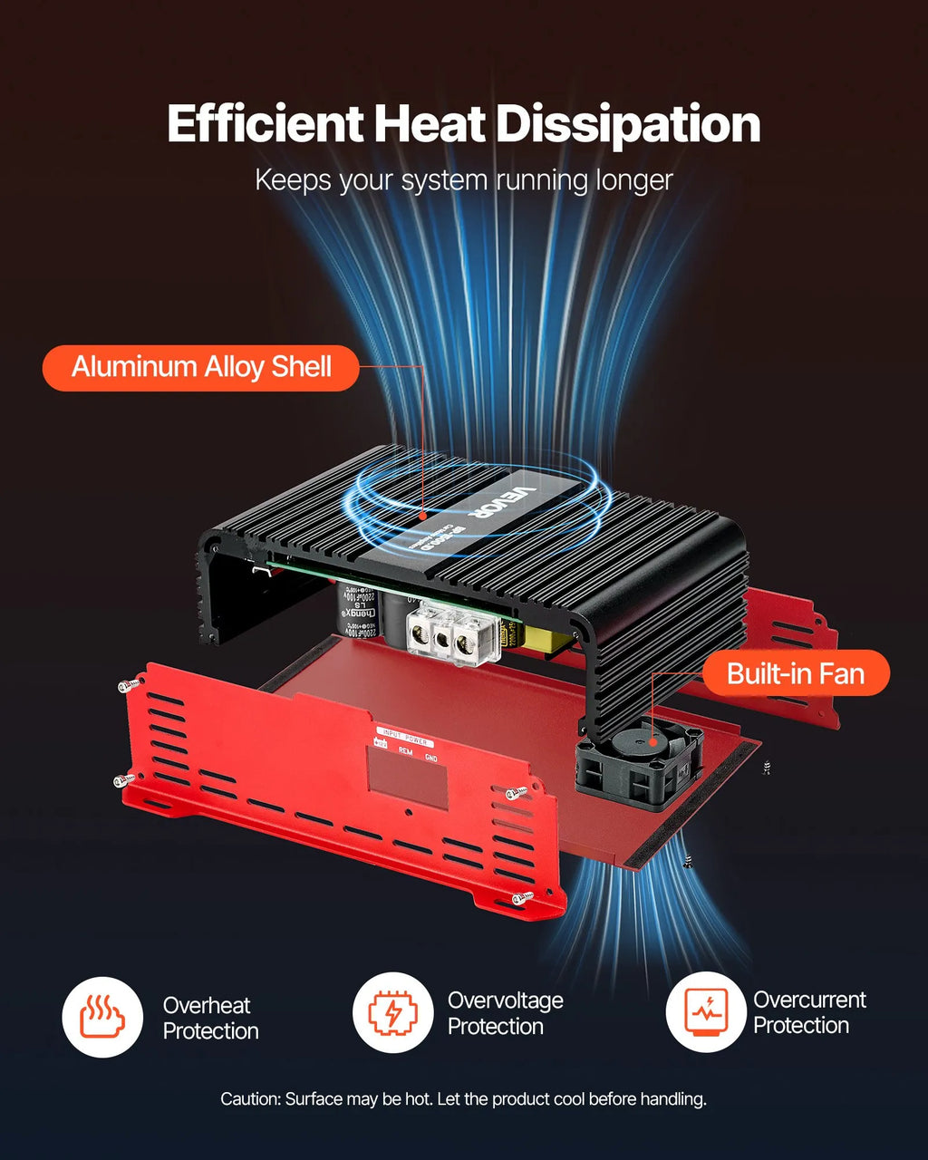 Dzesēšana un aizsardzība: alumīnija sakausējuma korpuss un iebūvēts ventilators nodrošina efektīvu siltuma novadi stabilai ilgstošai darbībai ar lielu jaudu. Temperatūras, pārstrāvas un pārsprieguma aizsardzība ar reāllaika atgriezenisko saiti garantē drošu lietošanu.