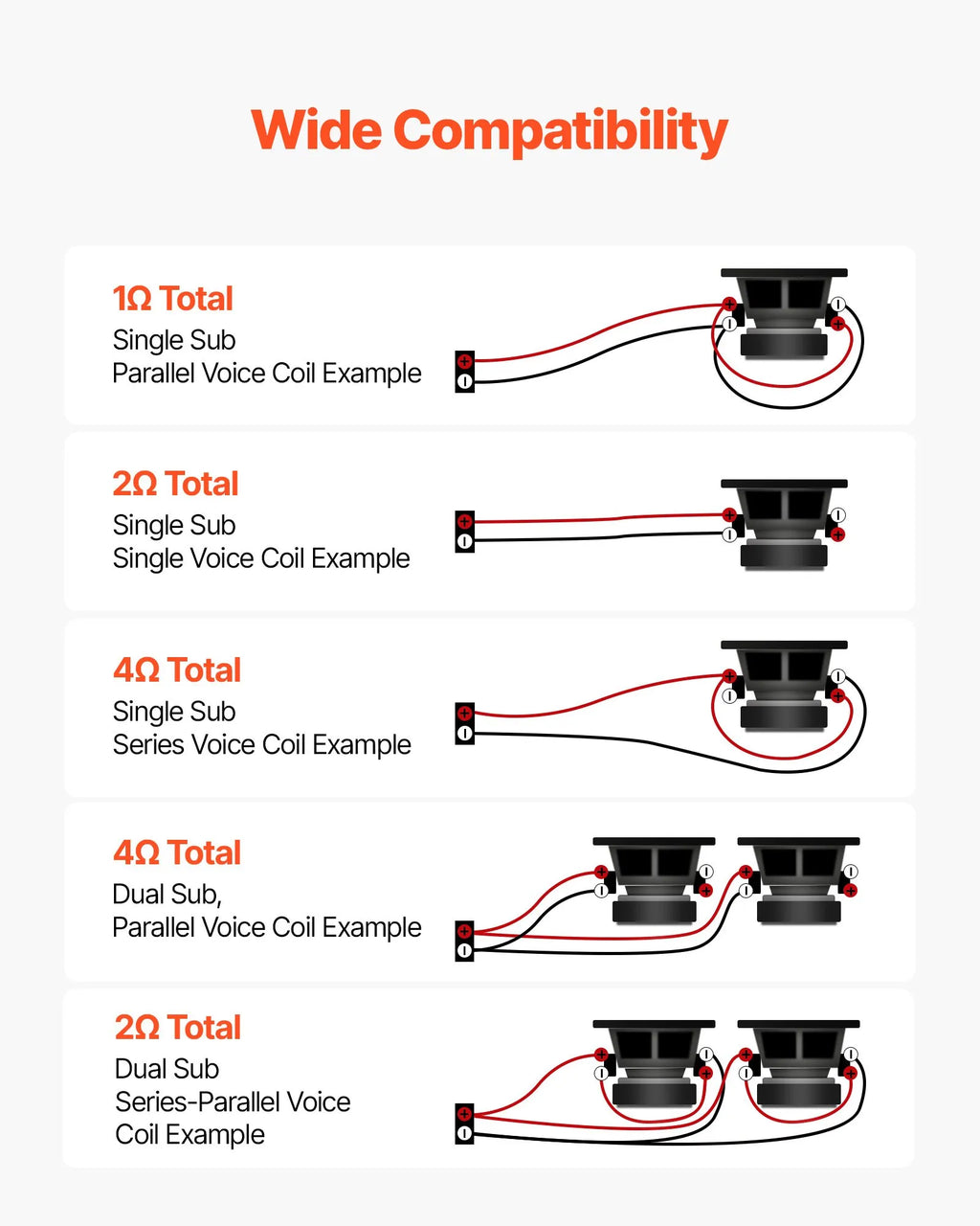 Plaša saderība: šis automašīnas audio pastiprinātājs darbojas ar lielāko daļu sedanu un pikapu rūpnīcas audio sistēmu, atbalsta 1/2/4 Ω slodzes un elastīgu pieslēgšanu. Saderīgs ar 25,4 cm un 30,5 cm vienas vai dubultās balss spoles subwooferiem. DIY uzstādīšana ir vienkārša.