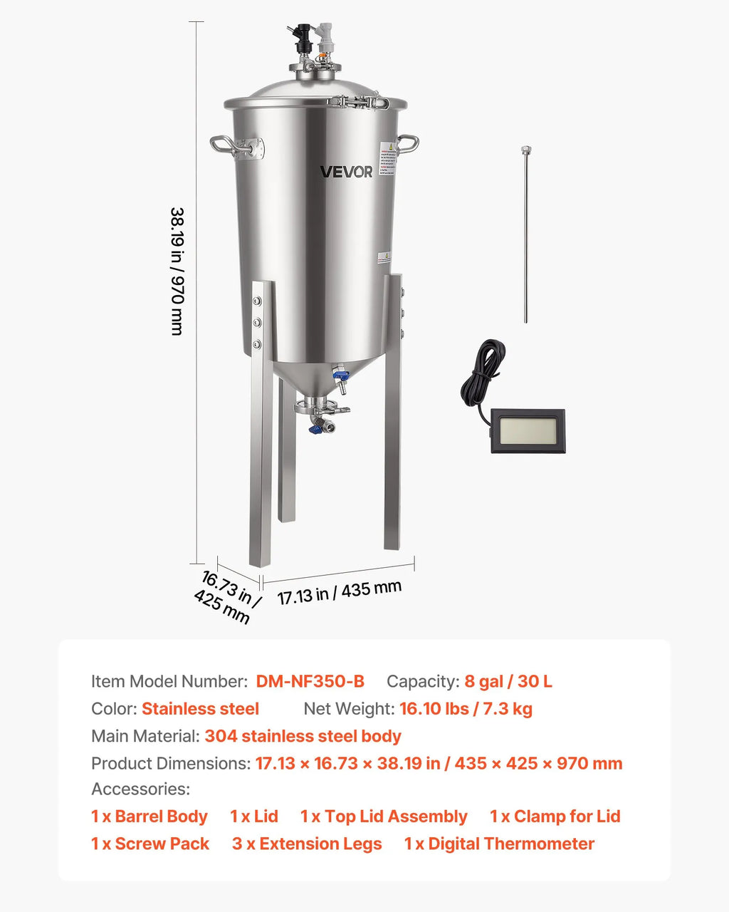 Liela ietilpība: Ar 30 l ietilpību šis tērauda fermentācijas trauks ir piemērots alus, vīna un augļu vīna raudzēšanai. Litru un galonu mērogas atzīmes nodrošina skaidrus rādījumus bez papildu pārrēķiniem.