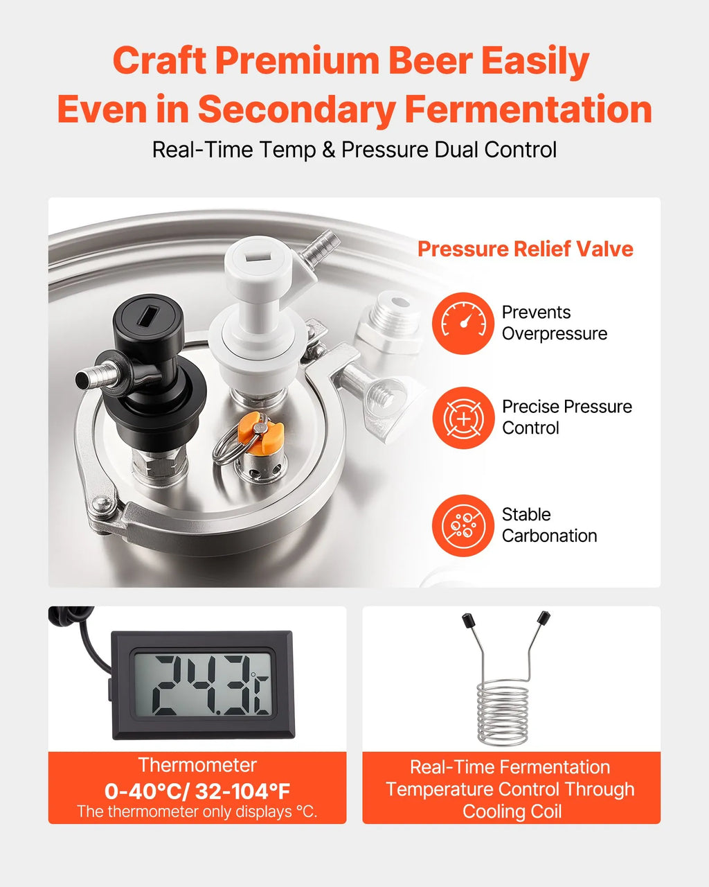 Efektīva temperatūras kontrole: Alus fermentators ir aprīkots ar dzesēšanas spirāli, ko var pievienot dzesētājam precīzai misas temperatūras kontrolei. Iebūvētais termometrs (0–40 °C) darbojas kopā ar spirāli, nodrošinot precīzu fermentāciju un stabilu garšu.
