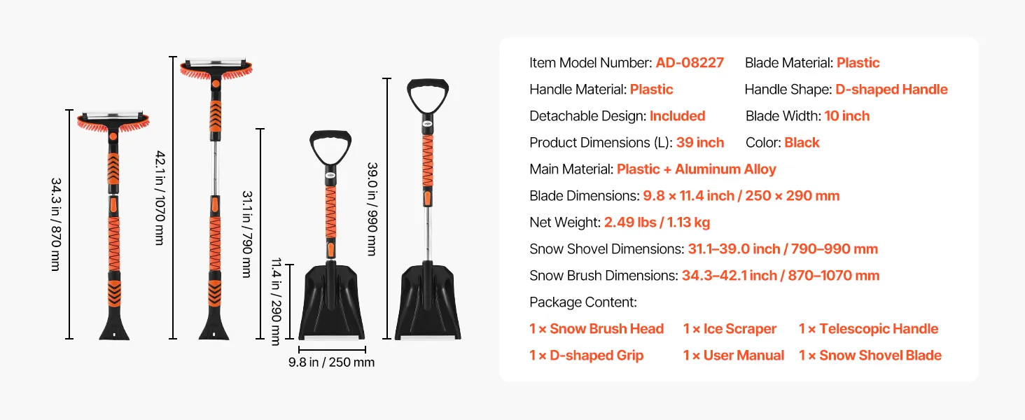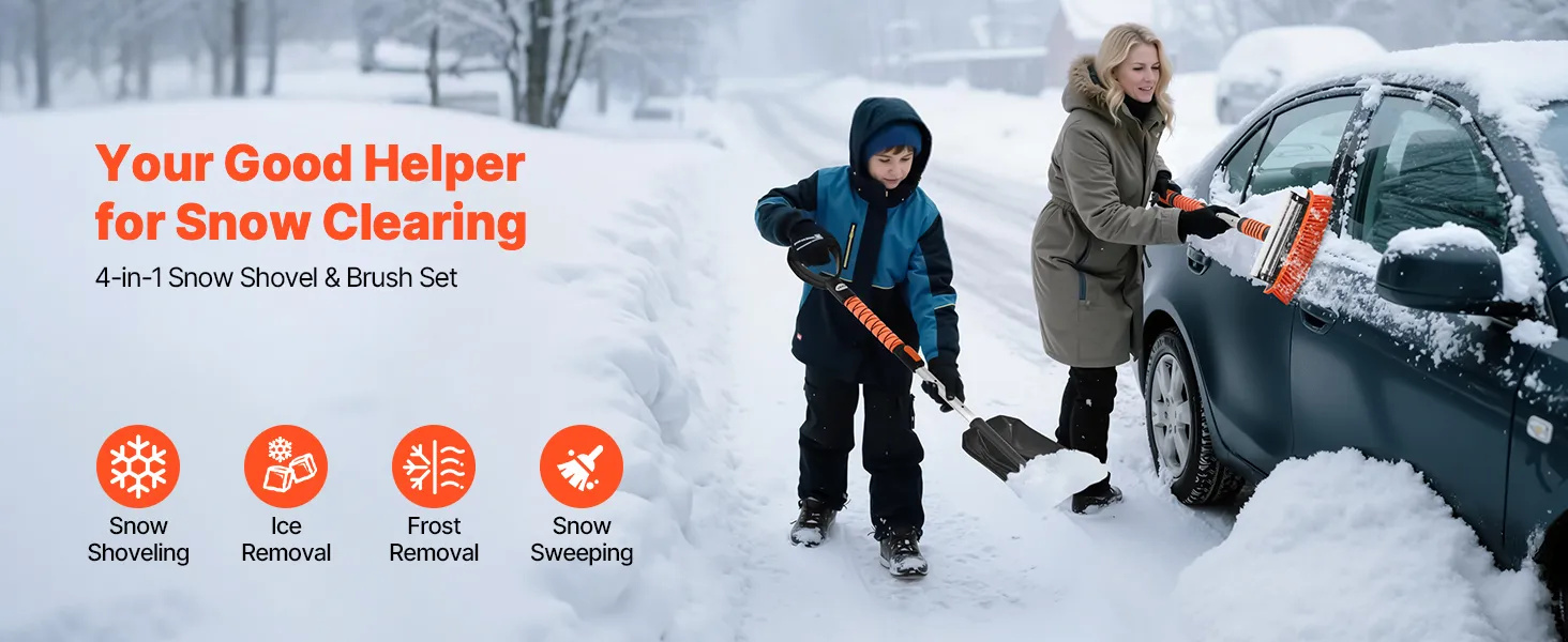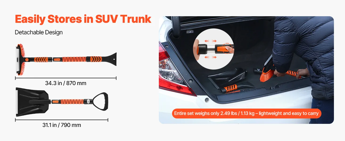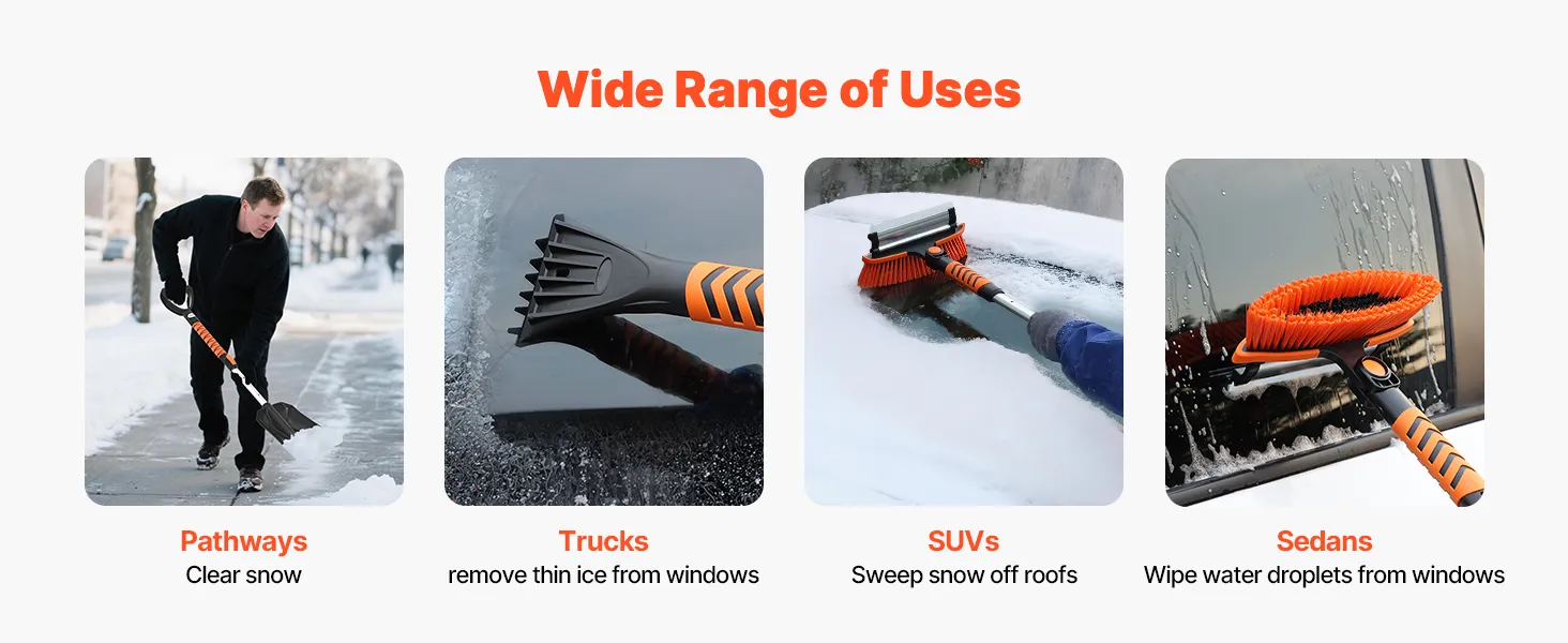 Daudzfunkcionāls sniega tīrīšanas rīks: Šis 4-in-1 komplekts apvieno lāpstu, birsti, sniega slotiņu un ledus skrāpi, ļaujot viegli notīrīt sniegu, apledojumu vai lapas. Praktisks un noderīgs rīks mājai, ceļojumiem vai ārkārtas situācijām.