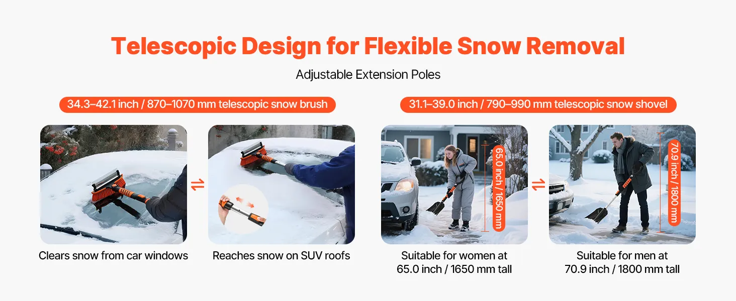Regulējams un elastīgs: Teleskopiskais ledus skrāpis un sniega birste izvelkami no 79 līdz 99 cm, bet birste - no 87 līdz 107 cm, pielāgojoties dažādiem lietotājiem. Rotējošā galva ļauj viegli notīrīt sniegu no logiem, jumtiem un šaurām vietām, uzlabojot tīrīšanas efektivitāti.