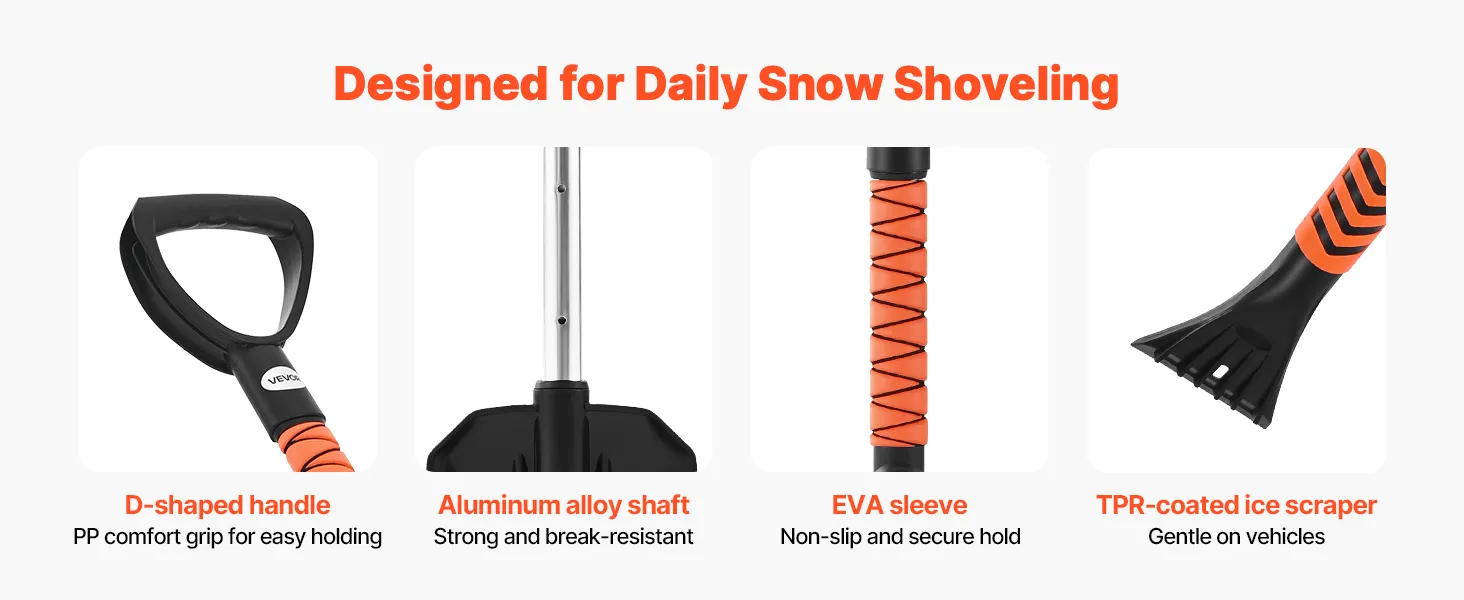 Drošība un komforts: Vieglā sniega lāpsta aprīkota ar EVA neslīdošu polsterējumu un D-formas rokturi drošai satveršanai. Alumīnija lāpstas asmens atvieglo sniega tīrīšanu, bet TPR pārklājums uz ledus skrāpja novērš virsmu bojāšanu.