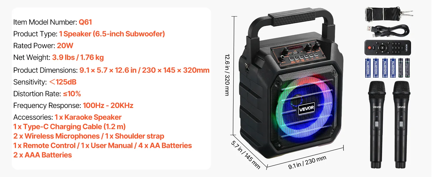 Skaidra un jaudīga skaņa: 6,5'' zemfrekvences skaļrunis un 20 W jauda nodrošina tīru skaņu. Komplektā divi bezvadu mikrofoni ērtai, brīvkabeļu lietošanai.