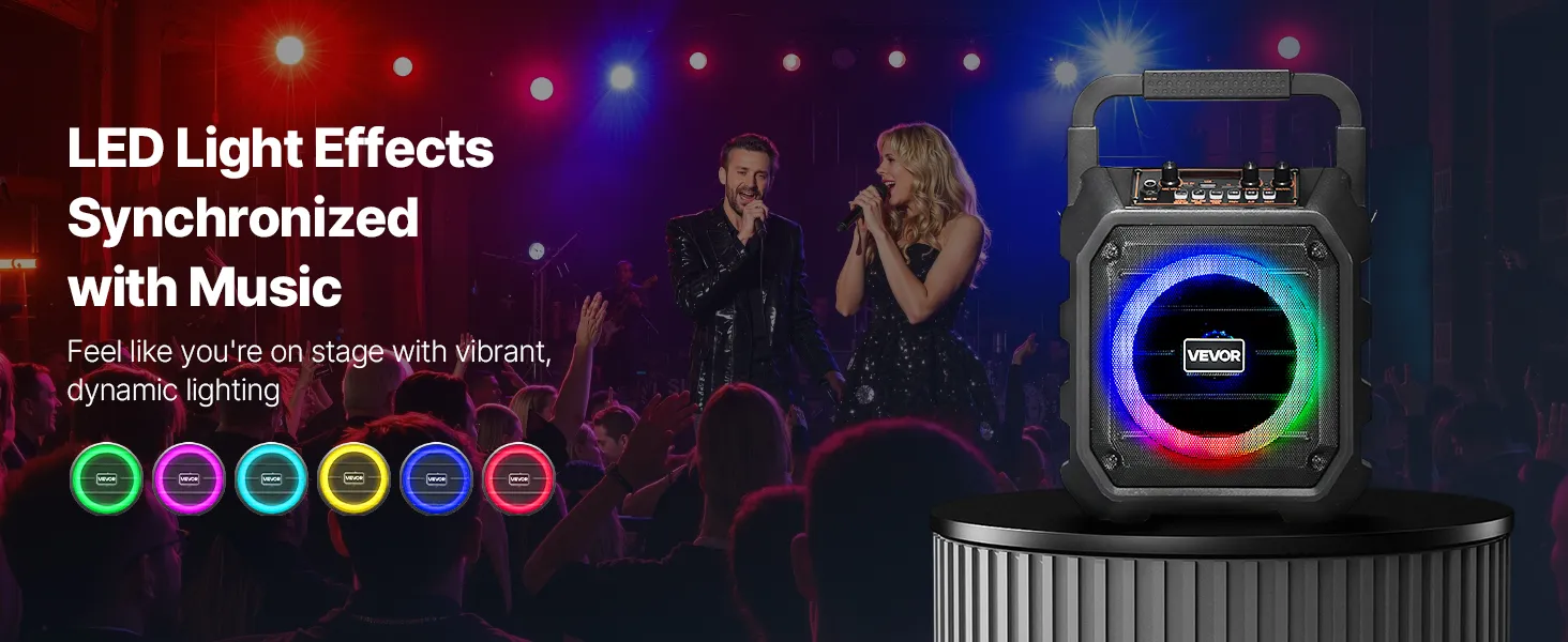 Iebūvētās LED gaismas rada īsto atmosfēru, sinhronizējoties ar mūzikas ritmu. Gaismas kustas līdzi skaņai, padarot katru dziesmu dinamisku un enerģisku, izmantojot mūsu karaoke ierīci.