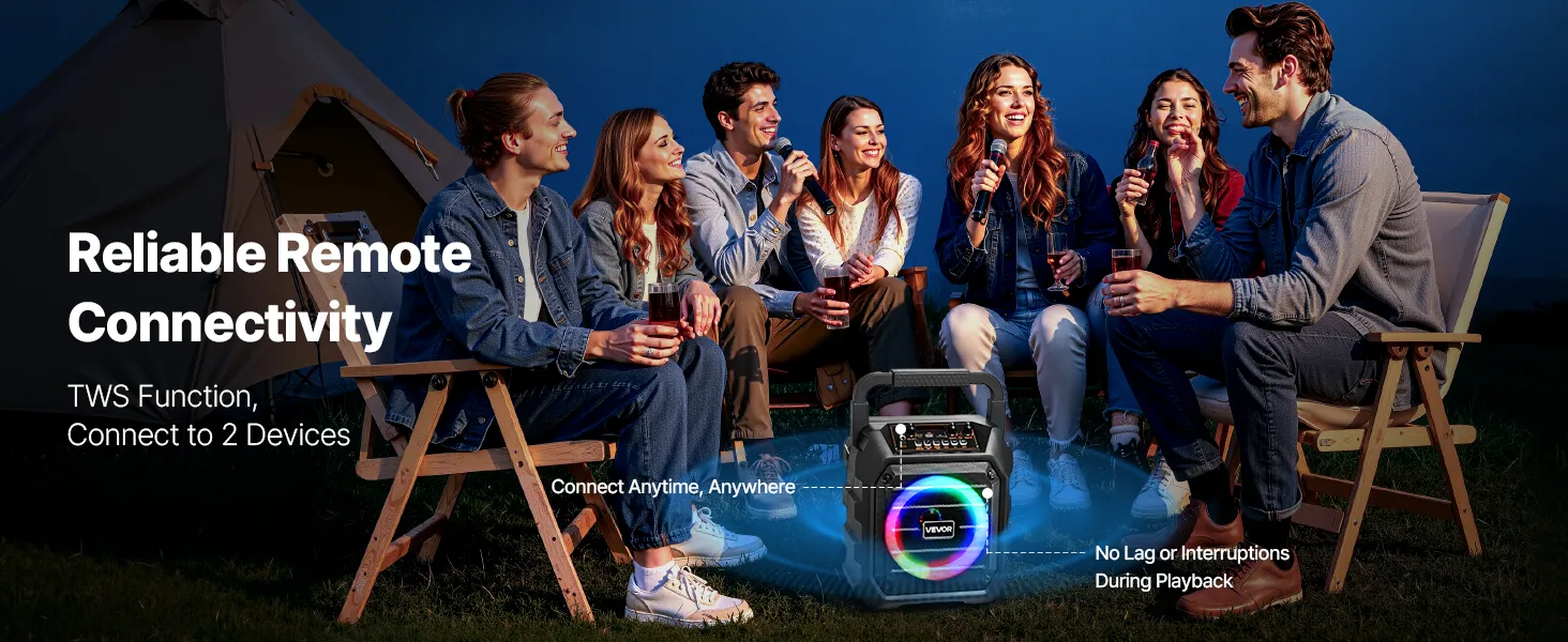 TWS 5.1 Bluetooth savienojamība: iespēja savienot divas karaoke ierīces stereo skaņai. Atbalsta microSD kartes, USB un AUX ieeju, kā arī darbojas ar Bluetooth ierīcēm — tālruni, planšeti, datoru vai projektoru.