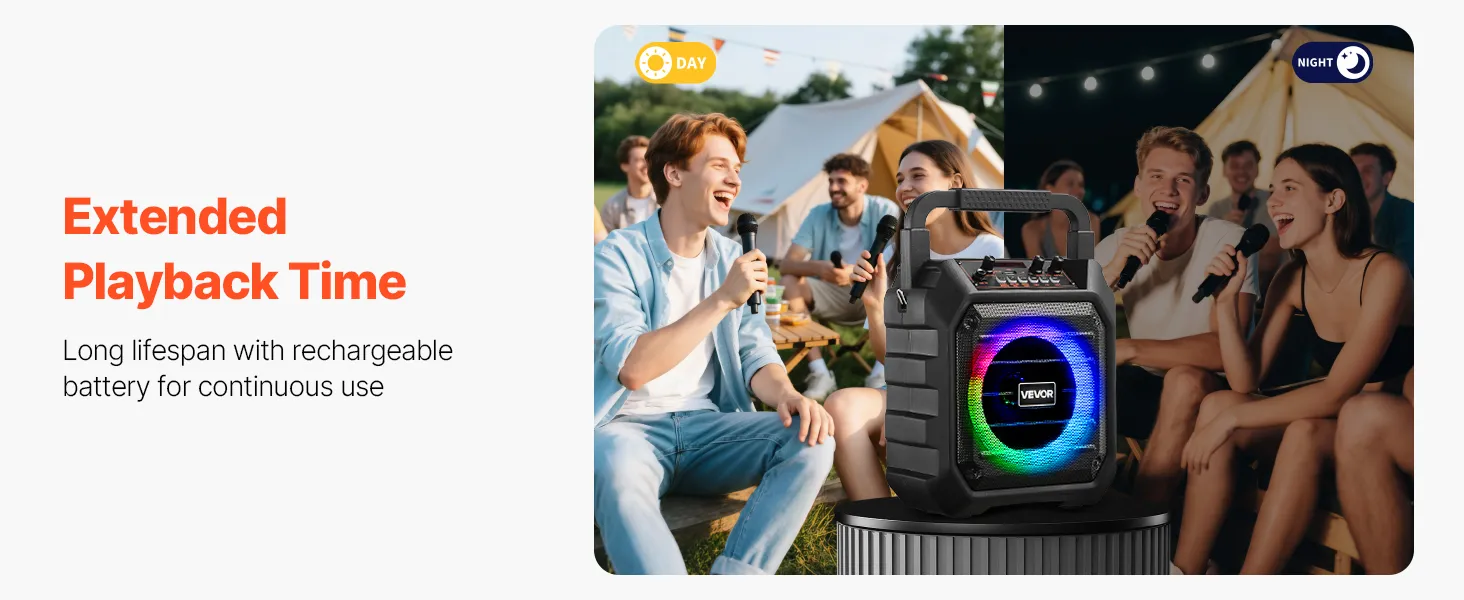 Šī pārnēsājamā karaoke ierīce ir aprīkota ar iebūvētu uzlādējamu akumulatoru ar zemu enerģijas patēriņu, nodrošinot nepārtrauktu mūzikas atskaņošanu. “Uzlāde un atskaņošana” režīms ļauj turpināt dziedāt arī uzlādes laikā, neizlaižot nevienu ritmu pat ilgstošās karaoke sesijās.