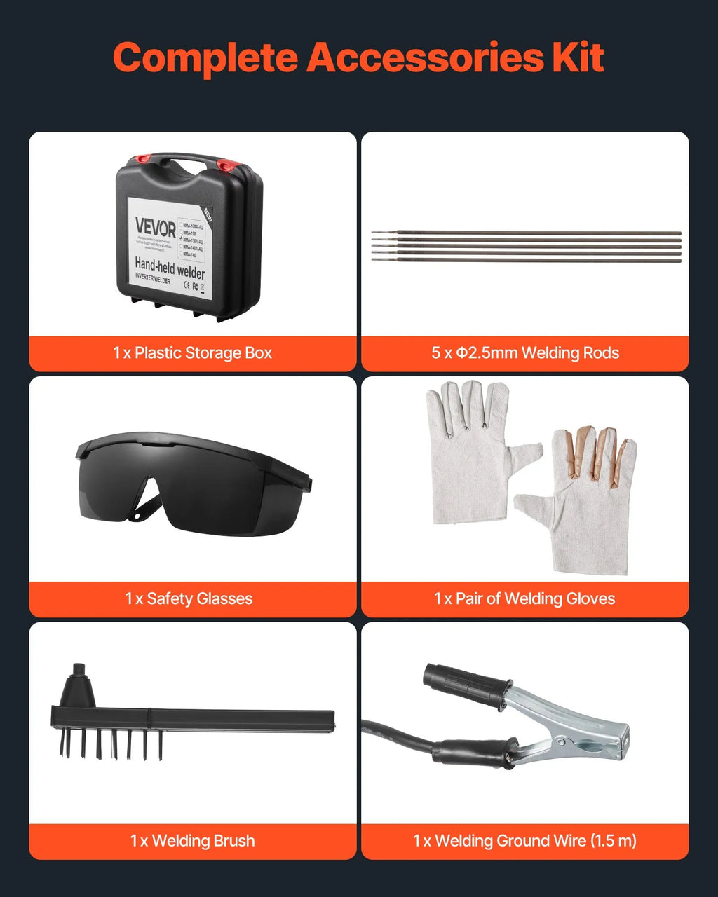 Visaptverošs metināšanas komplekts: Komplektā ietilpst 1 plastmasas uzglabāšanas kaste, 5 gab. Φ2,5 mm metināšanas stieņi, 1 aizsargbrilles, 1 pāris metināšanas cimdu, 1 metināšanas suka un 1 metināšanas zemējuma vads (1,5 m). Piemērots inženieru metināšanai, automašīnu remontam, mājas DIY projektiem un mehānismu ražošanai.