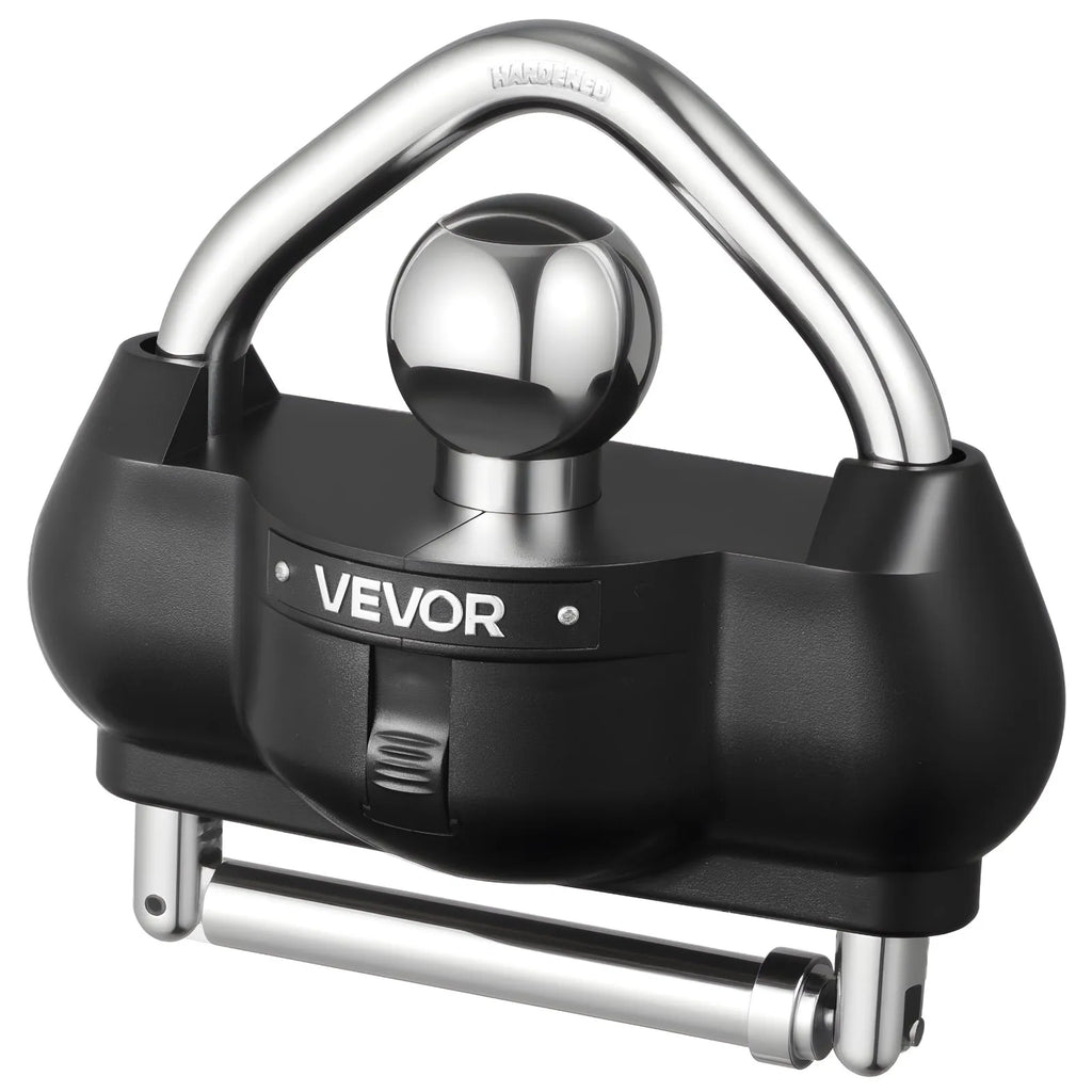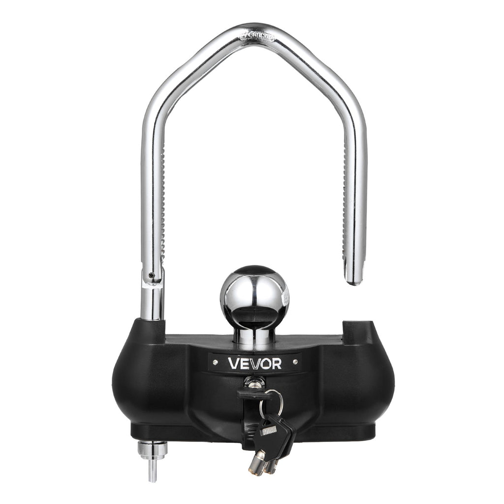 VEVOR piekabes sakabes slēdzene, piemērota 46 mm, 50,8 mm un 58,7 mm sakabēm, izturīga pret zādzību lodveida sakabes bloķētājs ar 3 atslēgām, noturīgs pret uzlaušanu, regulējama augstuma dizains kemperiem, laivām un piekabēm, melna.