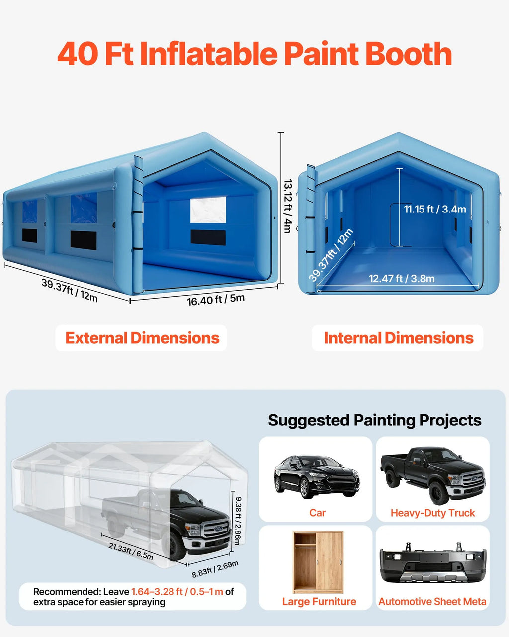 Ilgmūžīga konstrukcija: Mūsu piepūšamā krāsošanas kabīne ir izgatavota no augstākās kvalitātes 210D Oxford auduma ar pastiprinātām dubultšuvēm, izturīga pret plīsumiem un nodilumu, uzlabojot konstrukcijas izturību un hermētiskumu ilgstošai lietošanai āra vai profesionālā vidē.