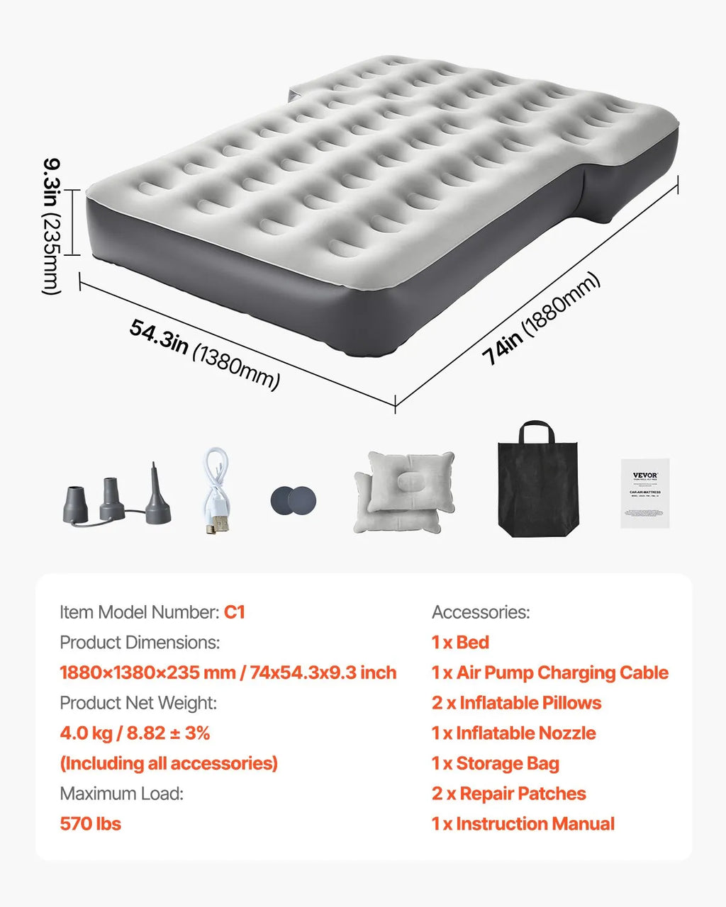 Pielāgots gaisa matracis: Piepūšamais kempinga matracis ir īpaši izstrādāts Toyota 4Runner un Jeep Wrangler modeļiem, lai nodrošinātu ideālu atbilstību plašajam automašīnas bagāžas nodalījumam. Maksimālā slodze līdz 259 kg. Matraci var pilnībā piepūst vairākiem lietotājiem.