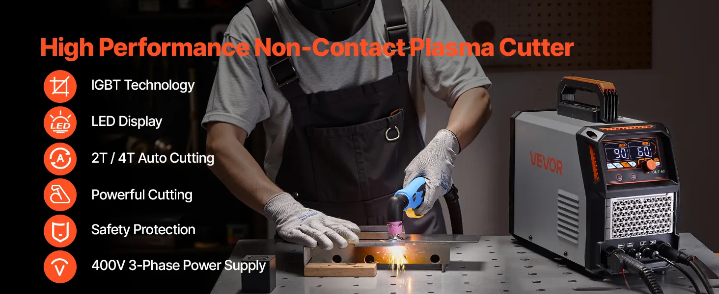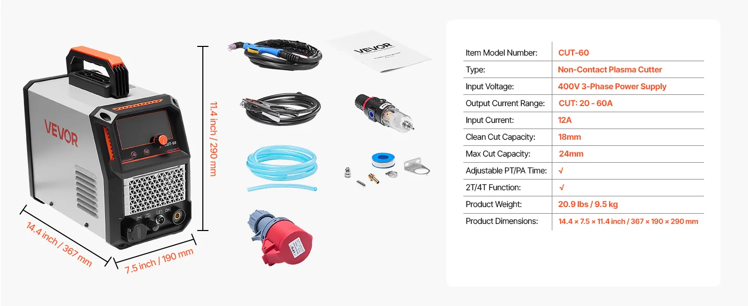 Jaudīga griešana: Šis VEVOR 400 V trīsfāžu plazmas griezējs nodrošina maksimālo izejas strāvu 60 A ar augstu griešanas jaudu. Tas spēj tīri griezt līdz 18 mm biezus materiālus, maksimālais griešanas biezums - līdz 24 mm.