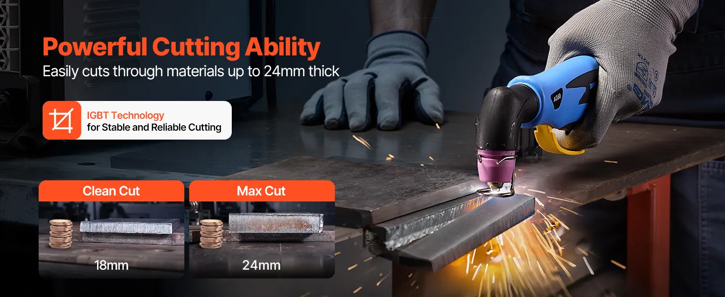 60 A maksimālā izejas strāva nodrošina tīru griezumu līdz 18 mm biezumā, ar maksimālo griešanas biezumu līdz 24 mm. (Izstrādāts darbam ar 400 V trīsfāžu barošanas avotu, galvenokārt paredzēts rūpnieciskai lietošanai)