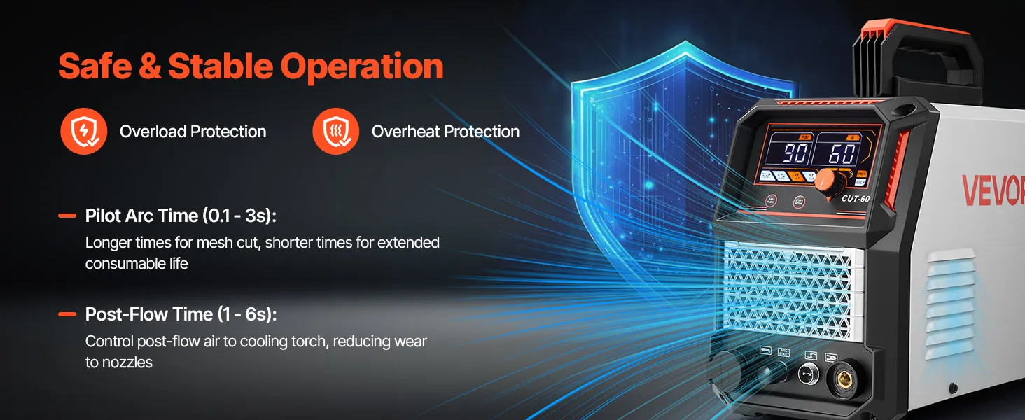 Šī plazmas griešanas iekārta ir aprīkota ar modernu IGBT invertora tehnoloģiju precīzai vadībai, nodrošinot stabilus un uzticamus griezumus. Iebūvētās aizsardzības sistēmas garantē vispusīgu drošību jūsu griešanas darbos!