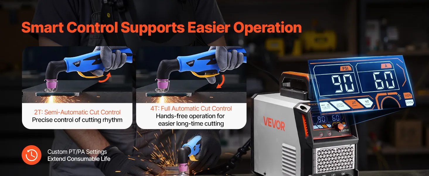 Inteliģenta vadība: Iekārta aprīkota ar regulējamu PT laiku (1-6 s) un PA laiku (0,1-3 s), kas pagarina patēriņa detaļu darbības ilgumu. Tāpat ir 2T/4T funkcijas: 2T režīms nodrošina daļēji automātisku griešanu īsiem, precīziem darbiem, bet 4T režīms - automātisku griešanu ilgstošai nepārtrauktai darbībai.