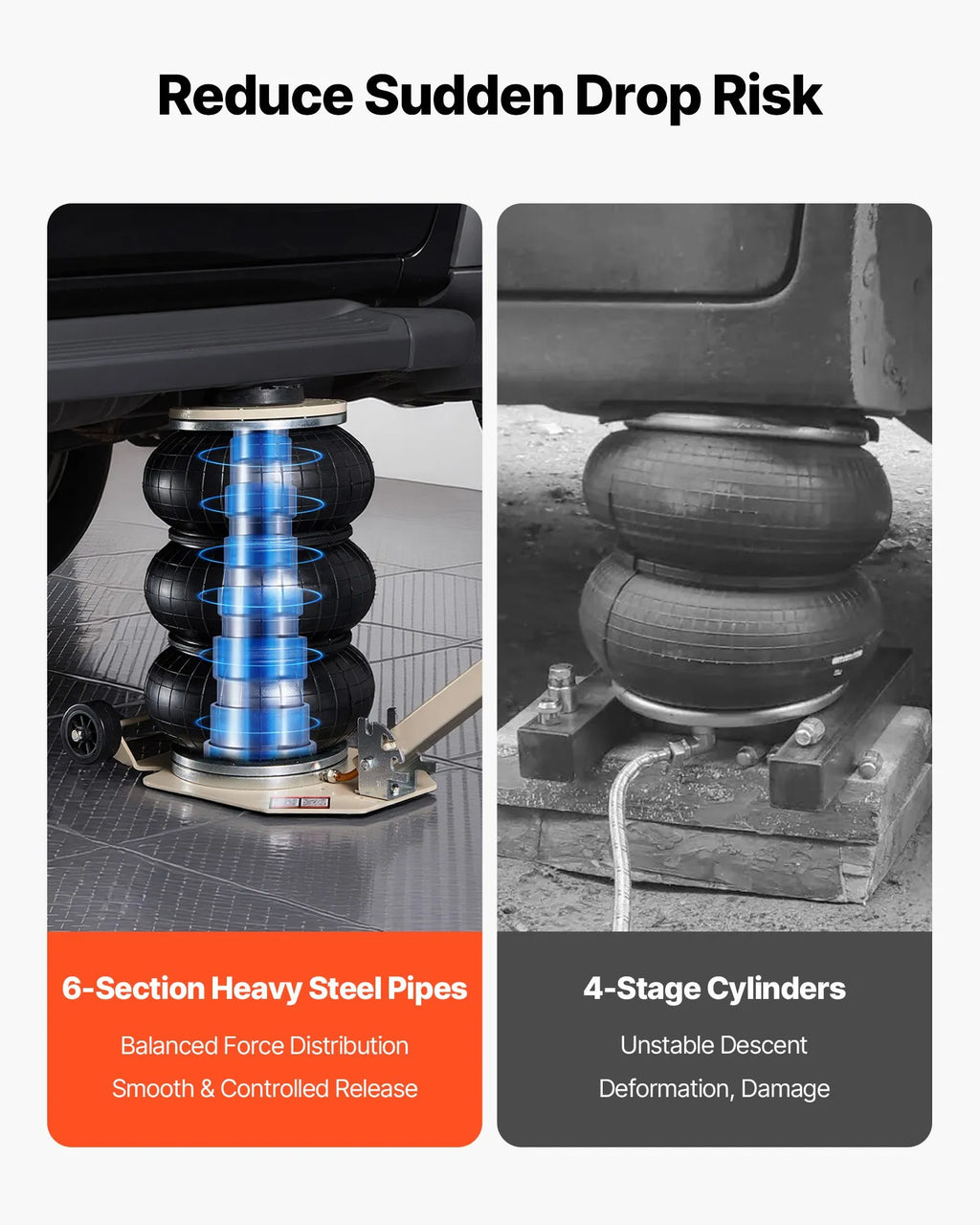 Izturīgs tērauda rāmis Mūsu gaisa spilvenu domkrats ir izgatavots no augstas kvalitātes tērauda ar elektrostatisku pulverkrāsas pārklājumu, kas nodrošina aizsardzību pret koroziju un ilgstošu lietošanu.