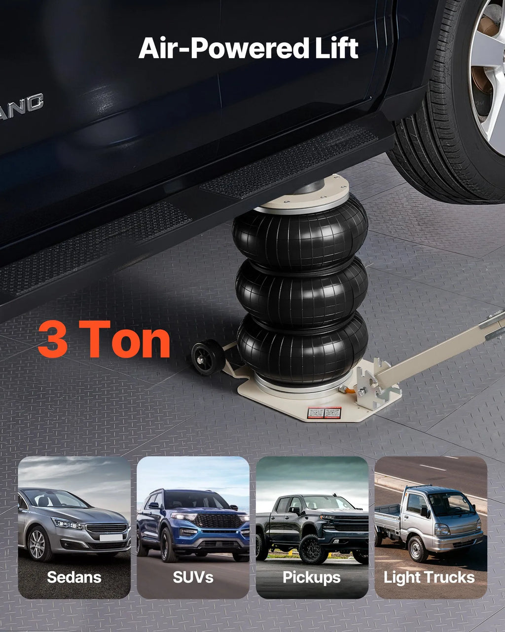 3 tonnu liela kravnesība: Šis gaisa spilvenu domkrats iztur līdz 3 t, piemērots vieglajām automašīnām, apvidus auto, pikapiem un vieglajiem kravas auto. Pastiprinātais trīsslāņu gaisa spilvens un paplašinātā pamatne nodrošina stabilu un drošu pacelšanu.