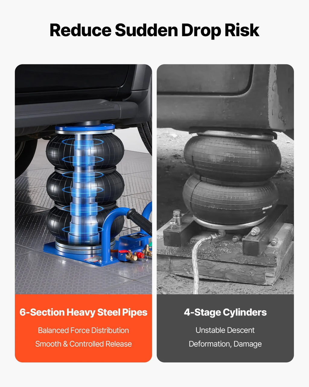 Kontrolēta un droša nolaišana: Gaisa domkrats ir aprīkots ar sešām izturīgām tērauda caurulēm, katrai ar īsāku gājienu, kas nodrošina vienmērīgu un stabilu nolaišanu un precīzu augstuma kontroli. Tas novērš pēkšņu krišanu, vienmērīgi sadala slodzi un pasargā no deformācijas vai sasvēršanās.