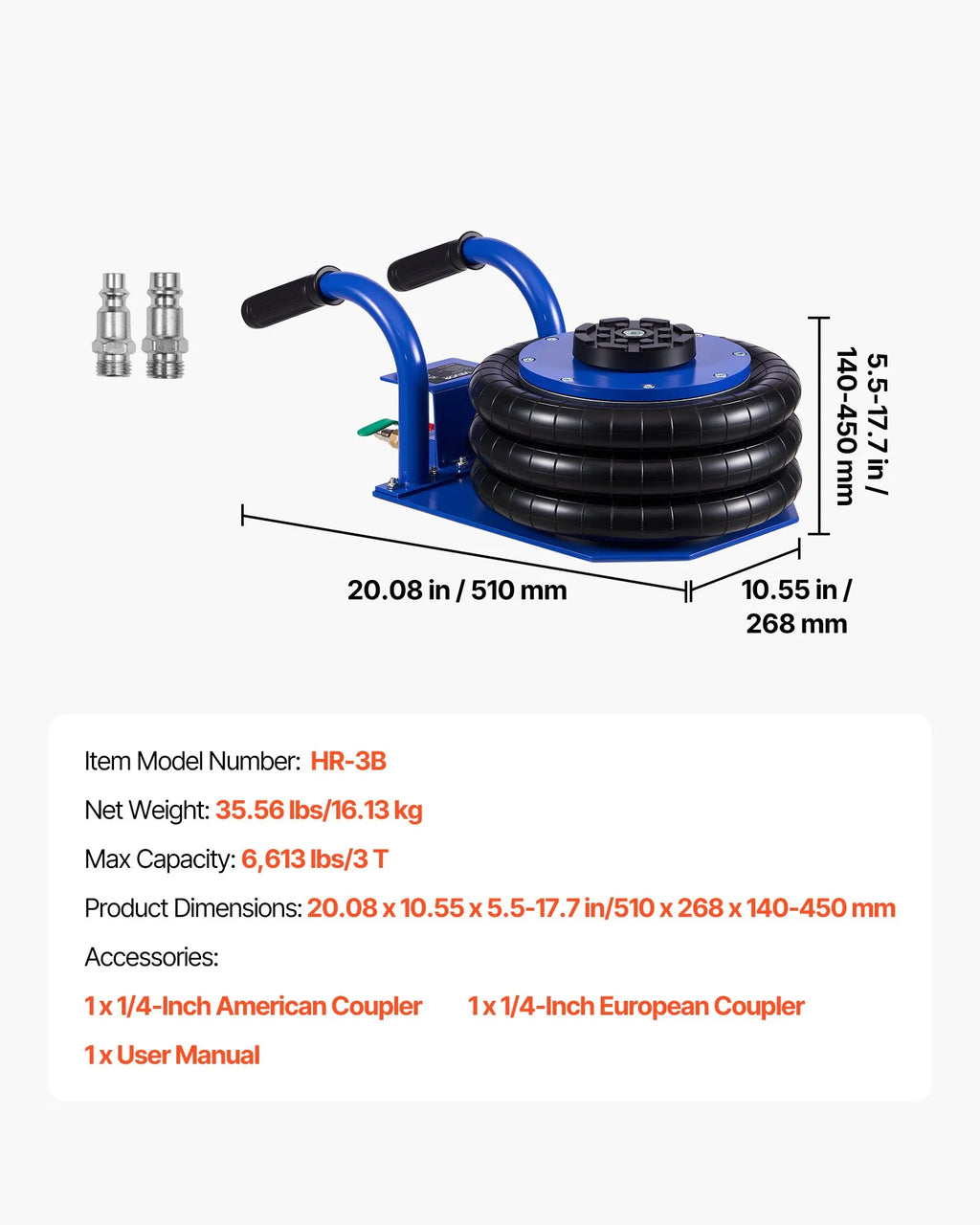 3 tonnu celtspēja: Šis gaisa spilvena domkrats iztur līdz 3 t slodzi, piemērots vieglajām automašīnām, SUV, pikapiem un vieglajiem kravas auto. Pastiprinātais trīsslāņu gaisa spilvens un paplašinātā pamatne nodrošina stabilu un drošu pacelšanu.