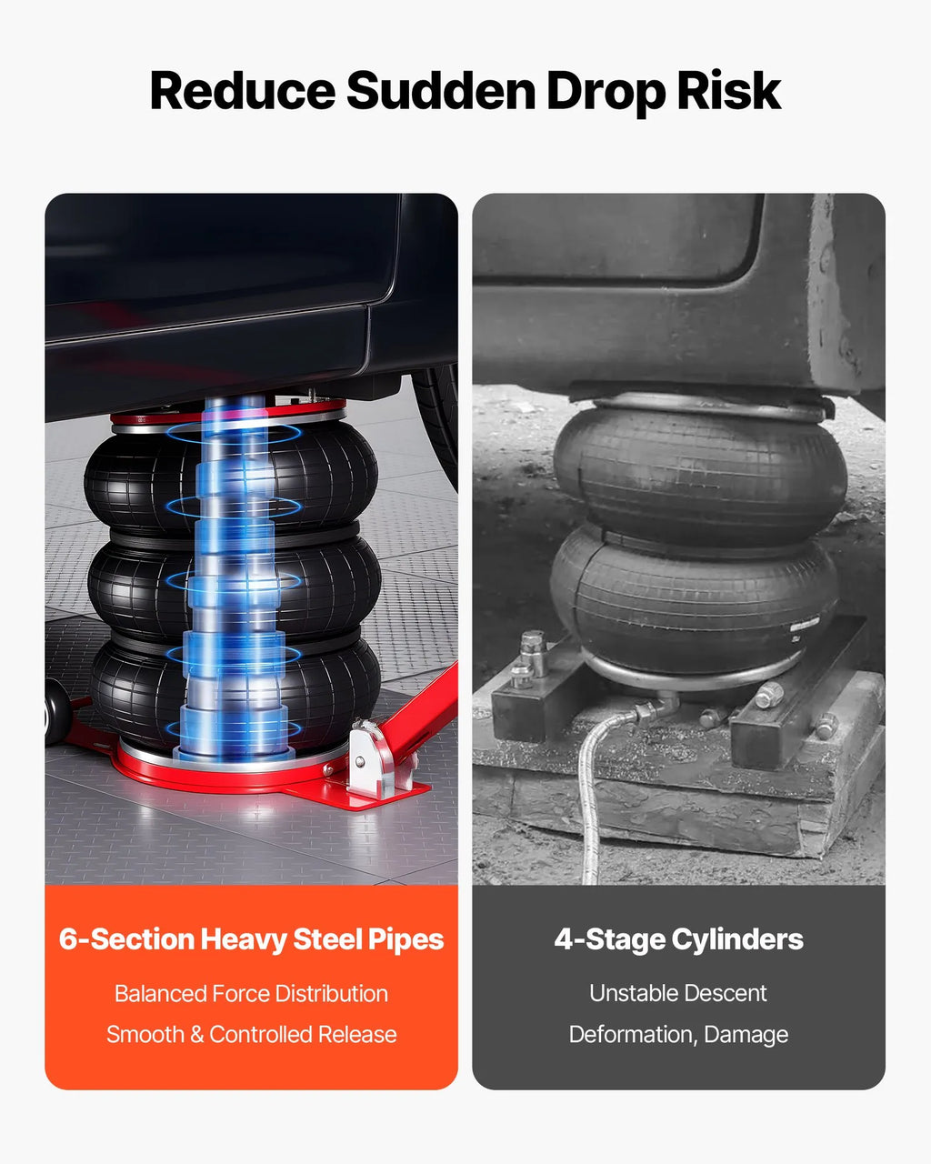 Kontrolēta un droša nolaišana: Gaisa domkrats ir aprīkots ar sešām izturīgām tērauda caurulēm, katrai ar īsāku gājienu, kas nodrošina vienmērīgu un stabilu nolaišanu un precīzu augstuma kontroli. Tas novērš pēkšņu krišanu, vienmērīgi sadala slodzi un novērš deformāciju vai sasvēršanos.