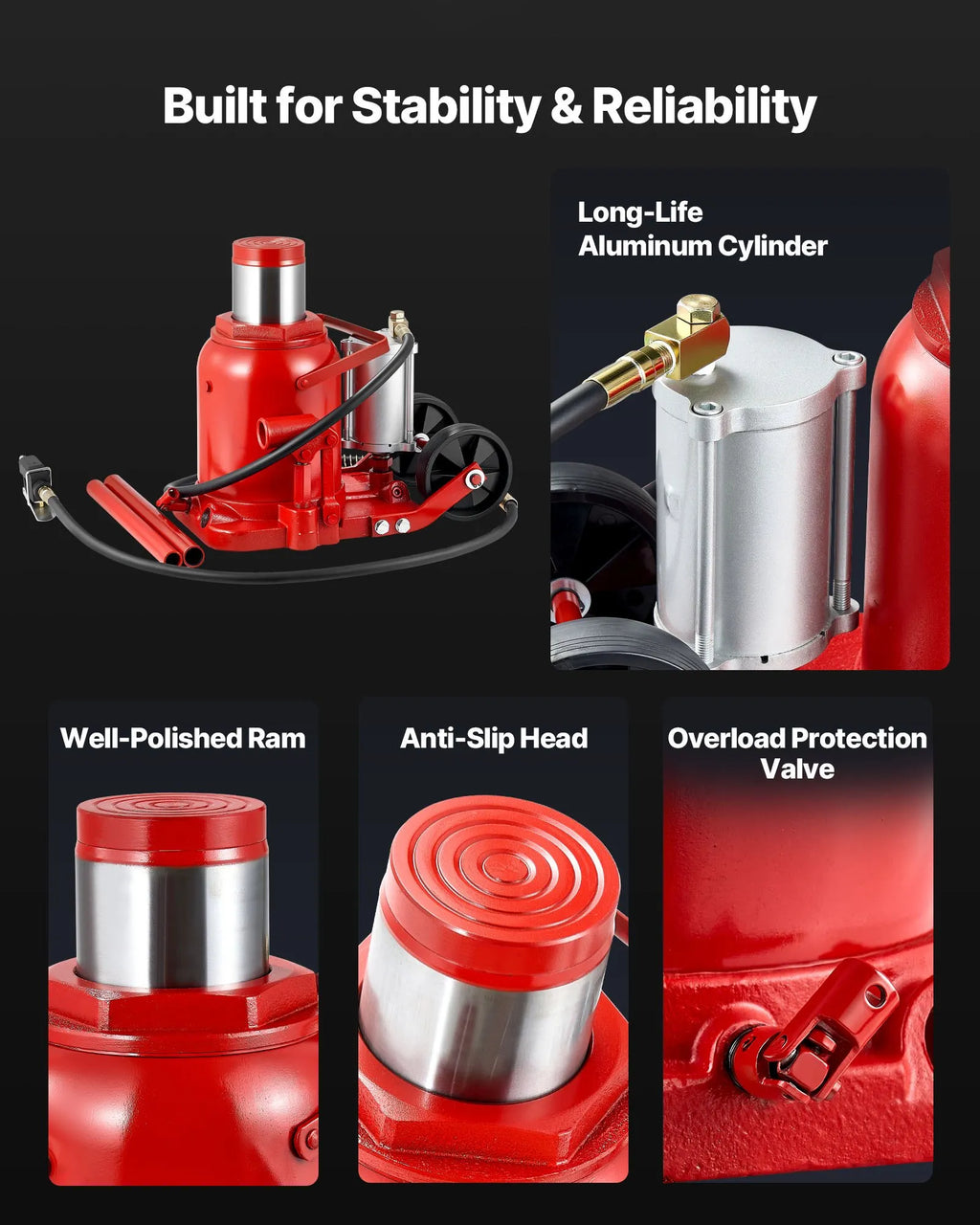 Šis manuālais un pneimatiskais hidrauliskais pudeles domkrats izmanto hidraulisko spēku, lai stabilā veidā paceltu līdz 50 t. Tas ir piemērots smagiem darbiem, piemēram, transportlīdzekļu remontam vai mājas uzturēšanas darbiem ar kravas automašīnām, kemperiem, pikapiem un SUV.