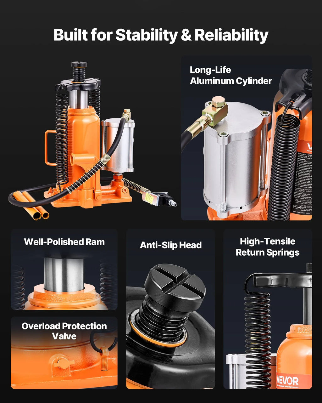 Šis manuālais un pneimatiskais hidrauliskais pudeles domkrats izmanto hidraulisko spēku, lai stabili paceltu slodzi līdz 20 tonnām. Tas ir piemērots smagiem darbiem, piemēram, transportlīdzekļu remontam vai mājas uzturēšanas darbiem ar kravas furgoniem, kemperiem, pikapiem un SUV.