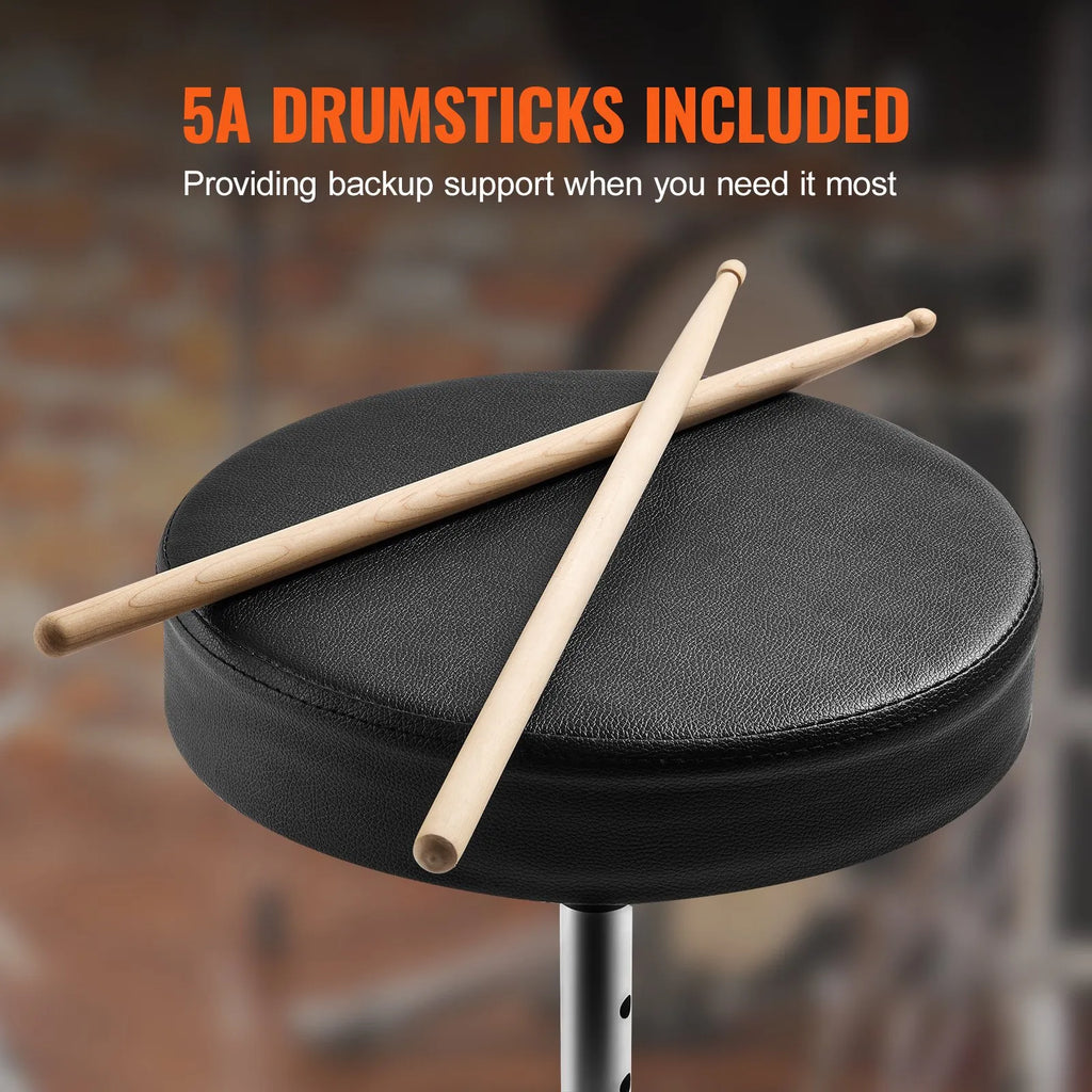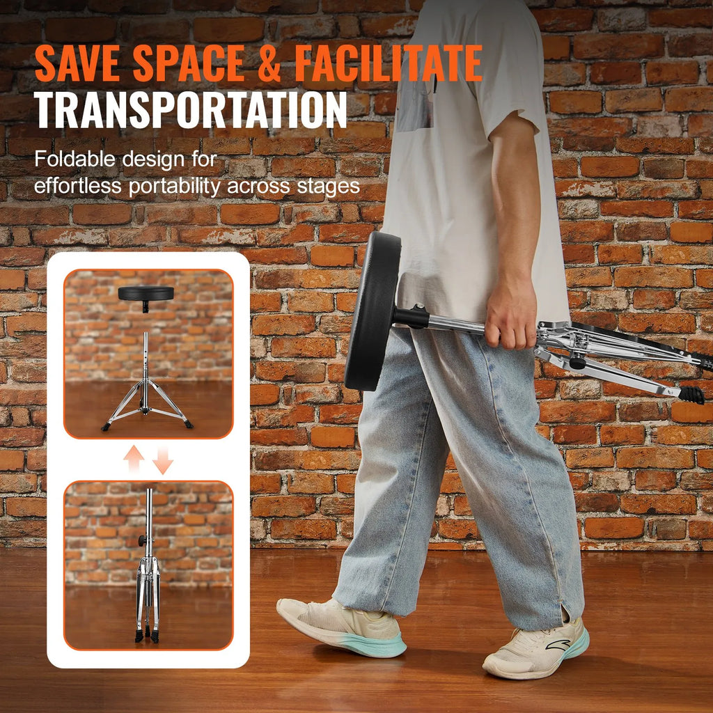 VEVOR regulējams bungu krēsls ar 490–585 mm augstumu, polsterētu sēdvirsmu, neslīdošām kājām, 5A bungu vicinātājiem un 150 kg slodzes kapacitāti; 360° rotējošs modelis bundziniekiem
