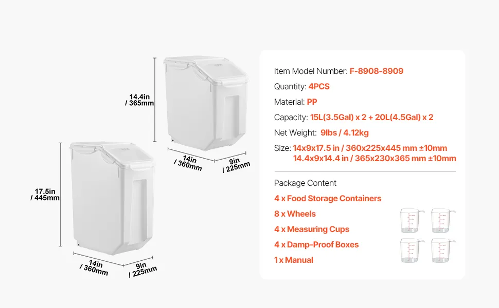 Īpaši liels un vietu taupošs: palieliniet uzglabāšanas vietu ar šo rīsu uzglabāšanas konteineru komplektu! Atkarībā no produktu izmēra un blīvuma 15 l konteiners var uzglabāt līdz 12 kg rīsu vai līdz 6 kg mājdzīvnieku barības, savukārt 20 l konteiners – līdz 16 kg rīsu vai līdz 8 kg barības. Piezīme: ietilpība var atšķirties atkarībā no sauso produktu izmēra, formas un blīvuma.