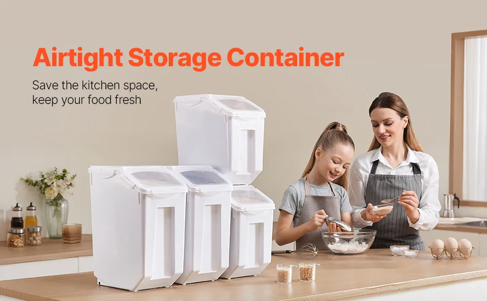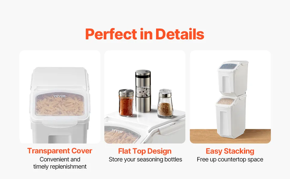 Caurspīdīgs vāks un riteņi: caurspīdīgais vāks ļauj ātri pārbaudīt atlikušo daudzumu. Konteineriem ir universālie, noņemami riteņi ērtai pārvietošanai. Uz plakana vāka var novietot garšvielu burciņas, kā arī konteinerus var stāvēt vienu uz otra, ietaupot vietu.