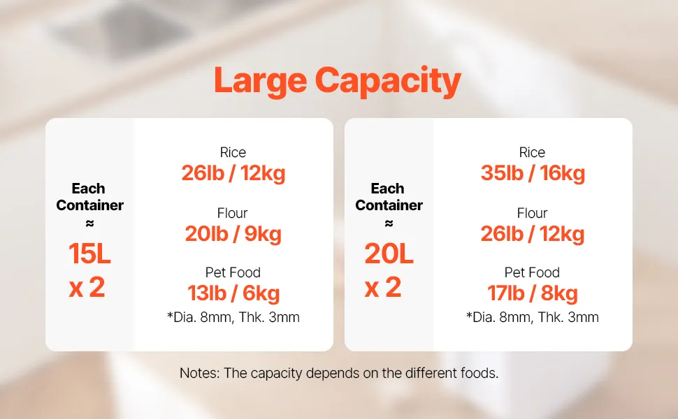 Atkarībā no sauso produktu veida un blīvuma 15 l konteiners var uzglabāt līdz aptuveni 12 kg rīsu vai līdz 6 kg mājdzīvnieku barības, bet 20 l konteiners – līdz aptuveni 16 kg rīsu vai līdz 8 kg barības. Tā sakraujamais dizains ļauj efektīvāk organizēt uzglabāšanas vietu.