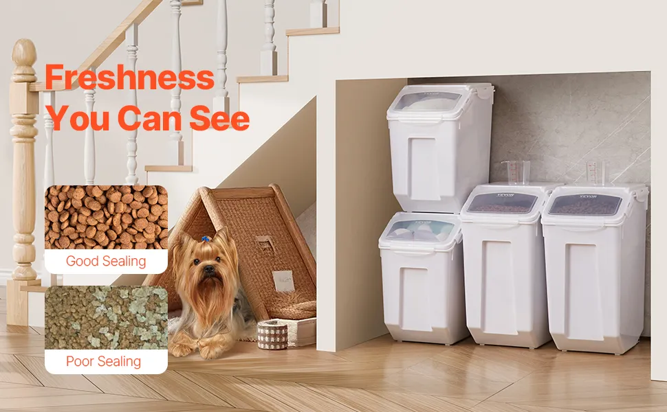100% hermētisks dizains: dubultā silikona blīve, mitrumdrošā kastīte un drošie aizdares klipši uztur produktus svaigus un pasargātus. Šis barības konteiners lieliski aiztur mitrumu un kukaiņus, tāpēc ir ideāli piemērots sauso produktu uzglabāšanai.