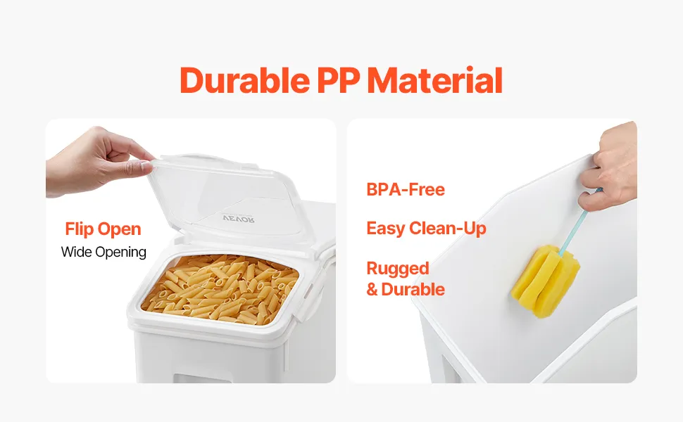 Pārtikas kvalitātes PP materiāls: izgatavots no BPA nesaturoša, netoksiska, pārtikas kvalitātes PP materiāla, kas ir izturīgs un drošs gan cilvēku pārtikas, gan mājdzīvnieku barības uzglabāšanai. Viegls kopšanai.