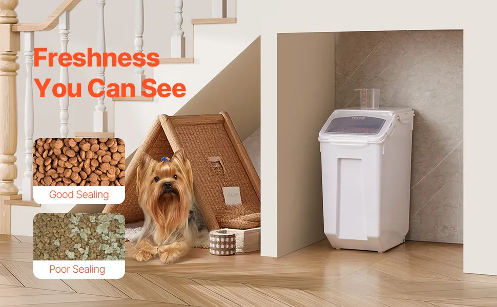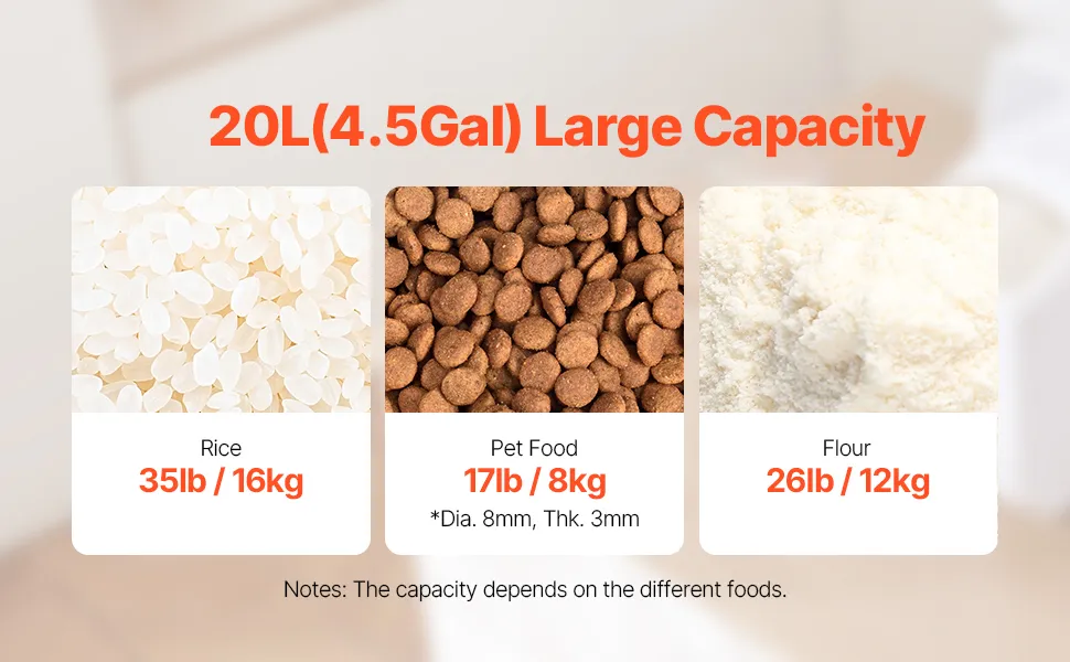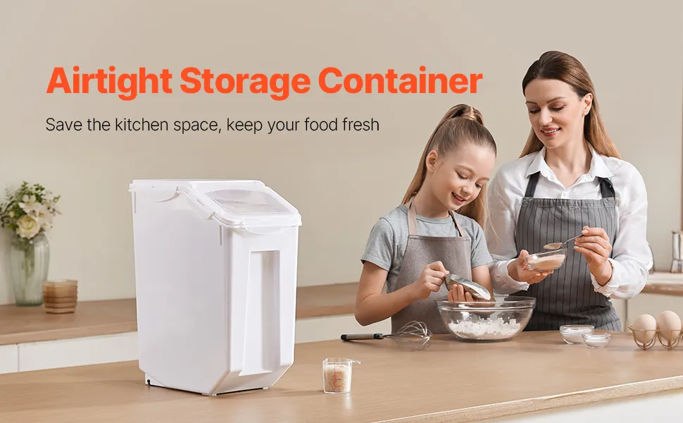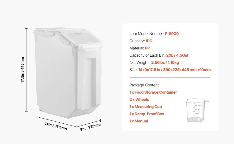 VEVOR rīsu un sastāvdaļu uzglabāšanas konteiners, 20 l ietilpības liels barības dozators ar riteņiem, mērbļodiņu un hermētisku vāku, piemērots graudiem, miltiem un mājdzīvnieku barībai, 1 gab.