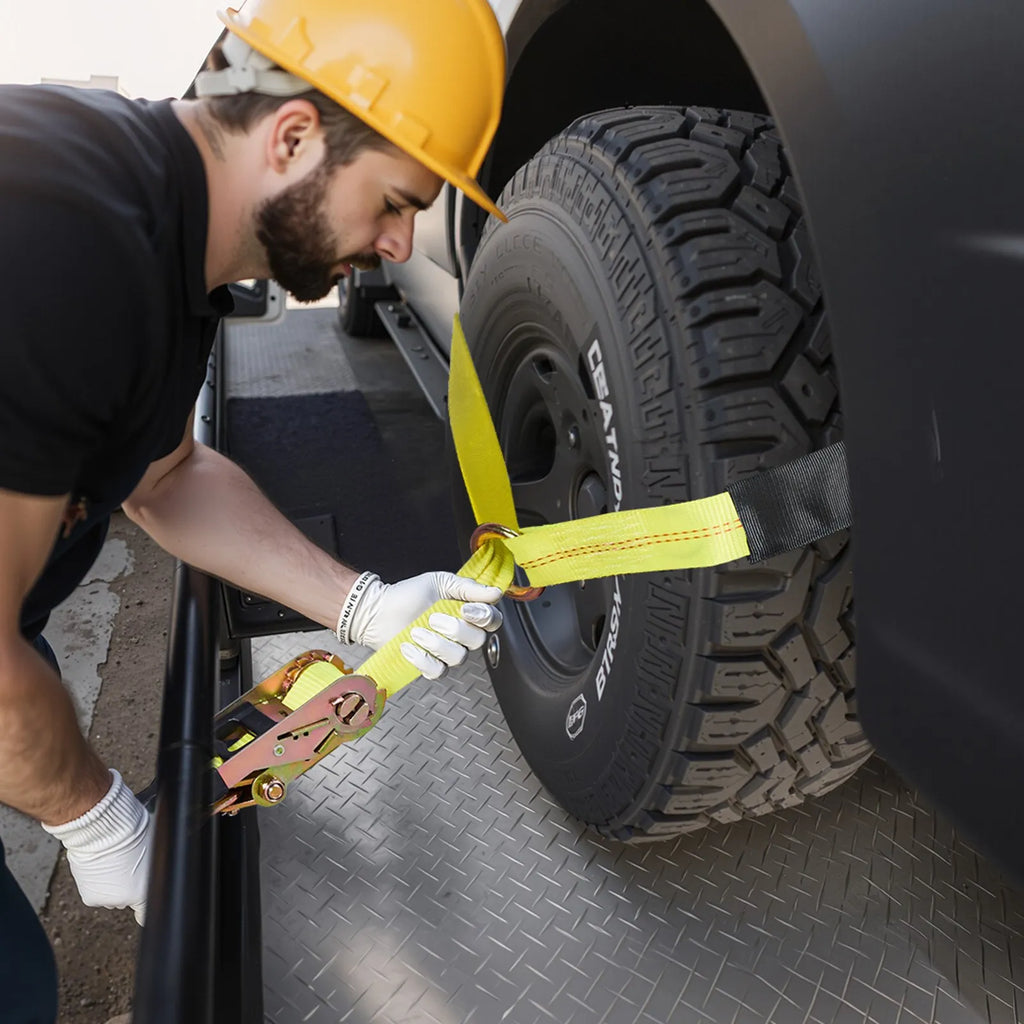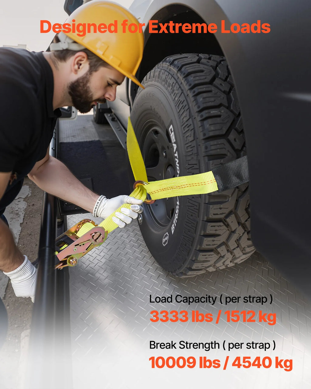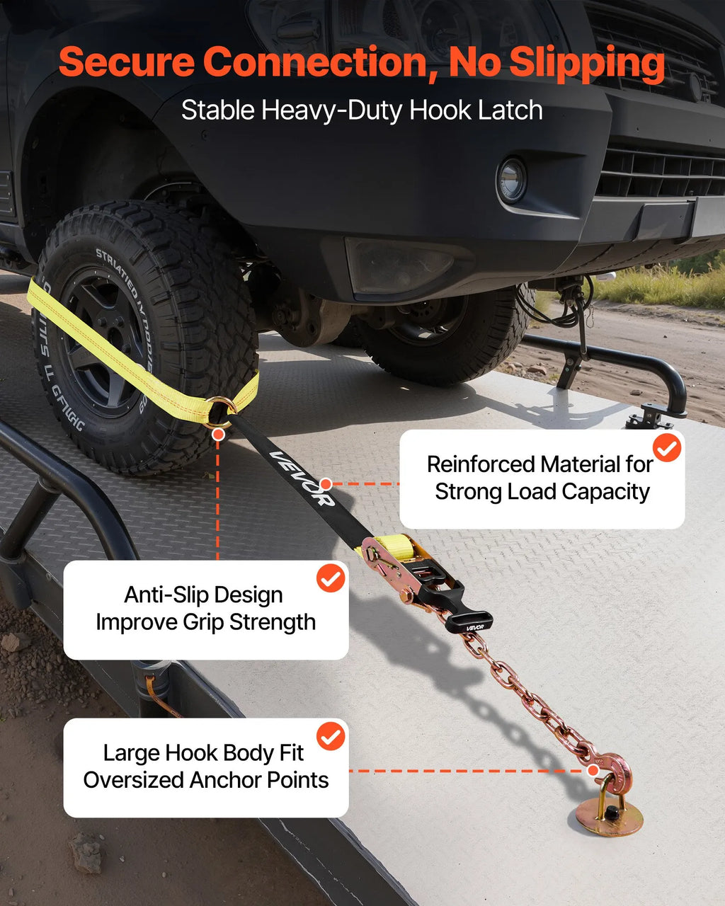 VEVOR riteņa fiksācijas un nostiprināšanas komplekts, riepas tipa vilkšanas ratiņu siksnas ar pastiprinātu āķi, pārrāvuma slodze 4540 kg, darba slodze 1512 kg, piemērots motocikliem, ATV, SUV un sniega motocikliem