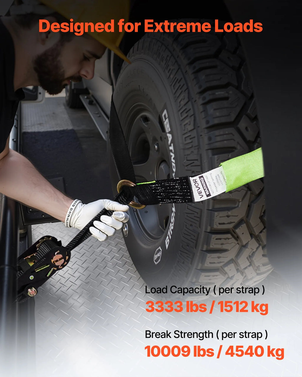 Sprūdrata siksnai ir riepām saudzējošs dizains ar mīkstiem materiāliem un gumijas blokiem, kas tieši saskaras ar riepu, samazinot berzi un spiedienu. Tas novērš riepu un disku bojājumus transportēšanas laikā. Komplektā ietilpst spriegotāji un 3048 mm siksnas — kopā 4 komplekti.