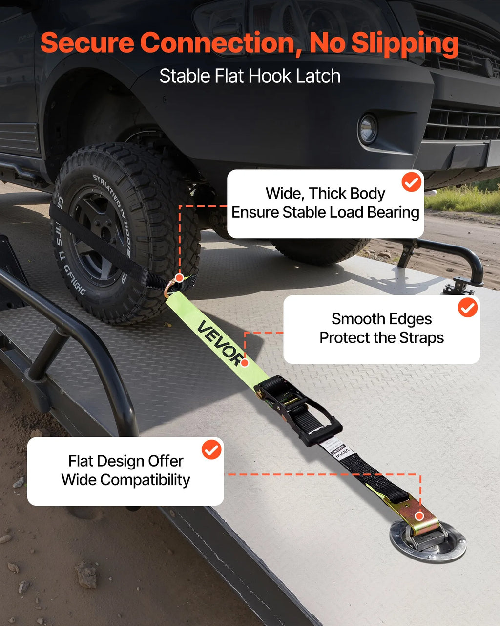 Aprīkots ar plakaniem āķiem, šis automašīnas nostiprināšanas komplekts nodrošina ātru un vienkāršu piestiprināšanu. Piestipriniet āķi pie stabila ass stiprinājuma punkta un pievelciet sprūdrata mehānismu, lai panāktu vienmērīgu un bezrūpīgu transportlīdzekļa fiksāciju.