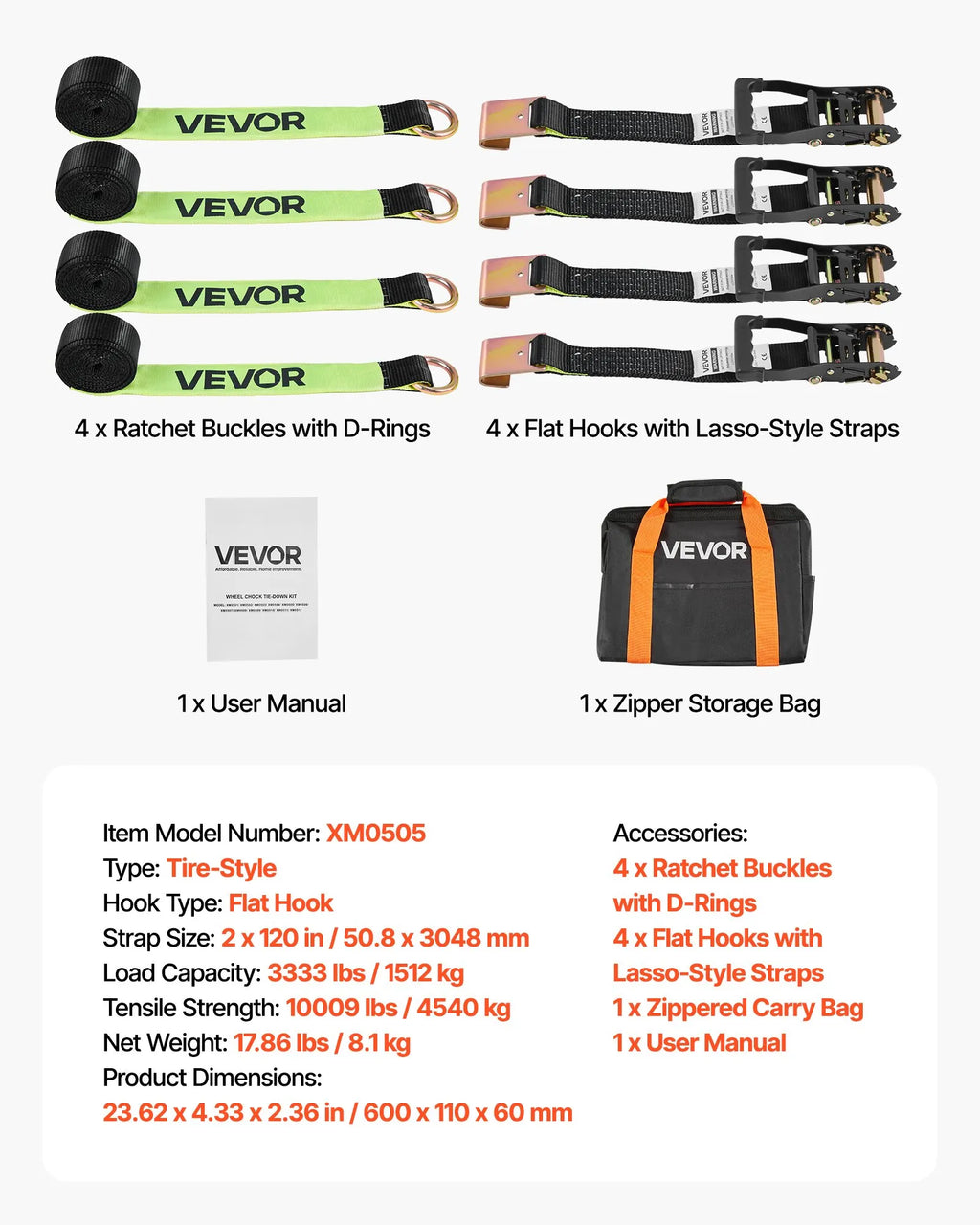 Mūsu riteņu nostiprināšanas komplekts nodrošina ātru un vienkāršu riepas fiksācijas risinājumu, ko var piestiprināt tieši ap riepu. Katra siksna iztur slodzi līdz 1512 kg, droši noturot transportlīdzekli vietā transportēšanas vai novietošanas laikā.