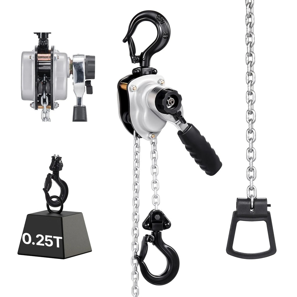 Produkta specifikācija Modeļa numurs: HSH0.25T Kravnesība: 250 kg / 0,25 t Ķēdes garums: 1,5 m Ķēdes klase: G80 Galvenie materiāli: sakausējuma tērauds, mangāna tērauds, Q235 oglekļa tērauds Āķa atvērums: 25 mm Izmēri: 275 × 63 × 96 mm Instrumentu somas izmēri: 270 × 120 × 85 mm Roktura garums: 18 mm Neto svars: 2,07 kg