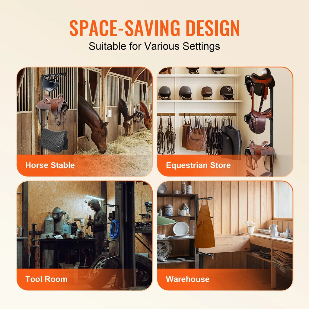 Daudzpusīga izmantošana: Ne tikai seglu statīvs! Ideāli piemērots arī iemauktu, ekipējuma, apģērba un citu piederumu glabāšanai. Elastīgais dizains piemērots stallim, garāžai vai ģērbtuvēm, būtiski uzlabojot telpas organizētību un ērtību.