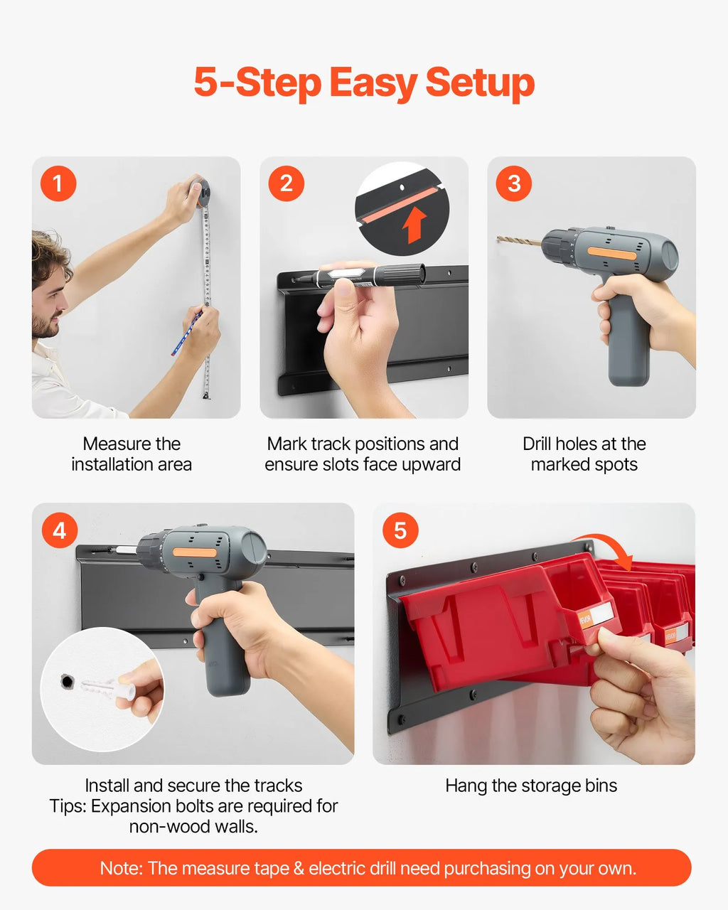 VEVOR sienas stiprināmo uzglabāšanas kastīšu komplekts, 12 plastmasas kastītes un 3 metāla sliedes, piekaramās un sakraujamās kastītes skrūvēm, uzgriežņiem, naglām un aprīkojumam, darbnīcai un garāžai, sarkans