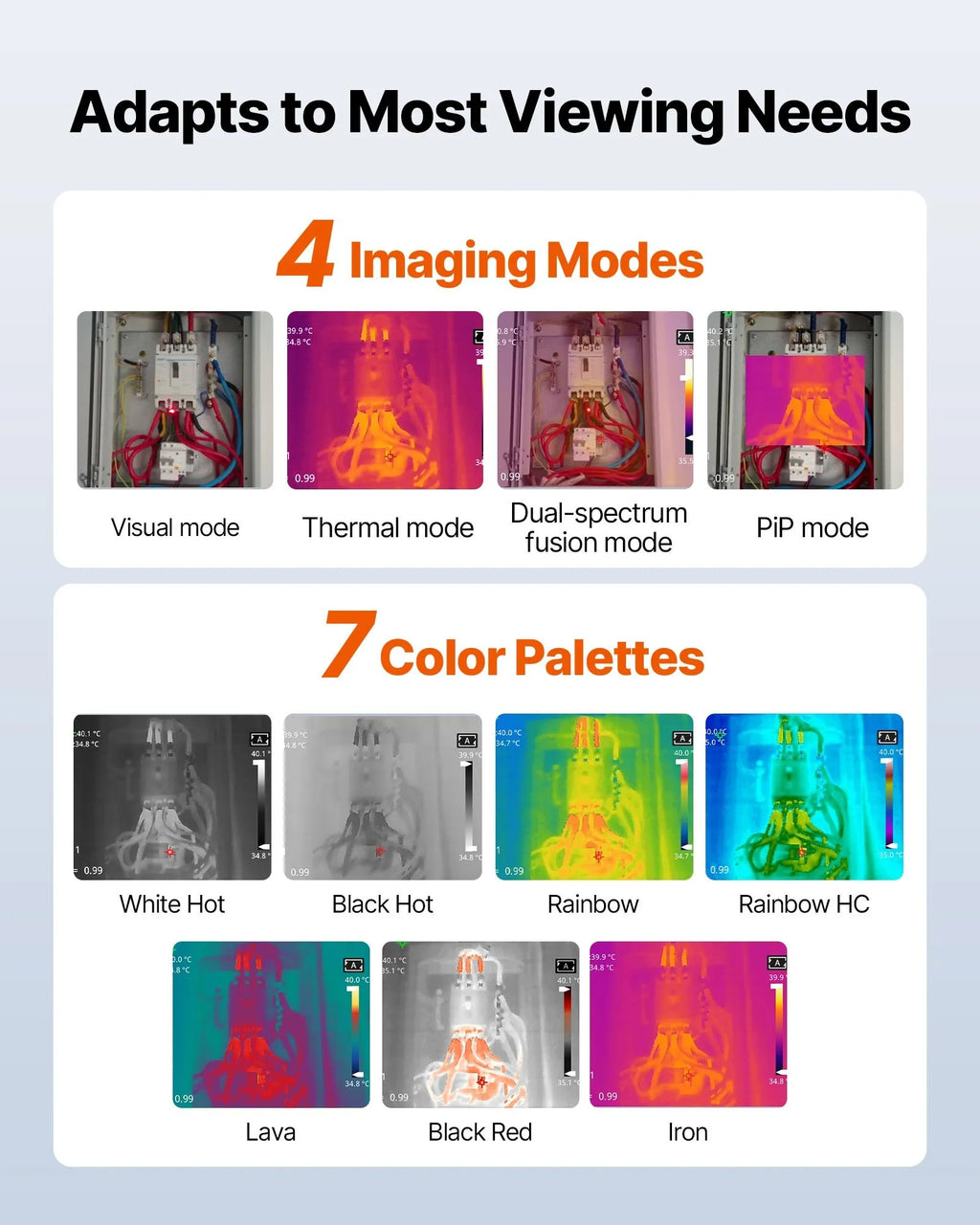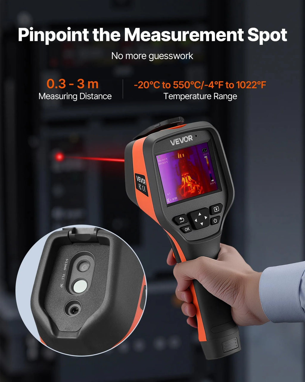 VEVOR termokamera, 256 × 192 IR izšķirtspēja, rokas infrasarkanā attēlveidošanas kamera ar 2 MP vizuālo kameru, 25 Hz atsvaidzes intensitāte, 8,9 cm skārienekrāns, temperatūras diapazons -20 °C līdz 550 °C, WiFi atbalsts