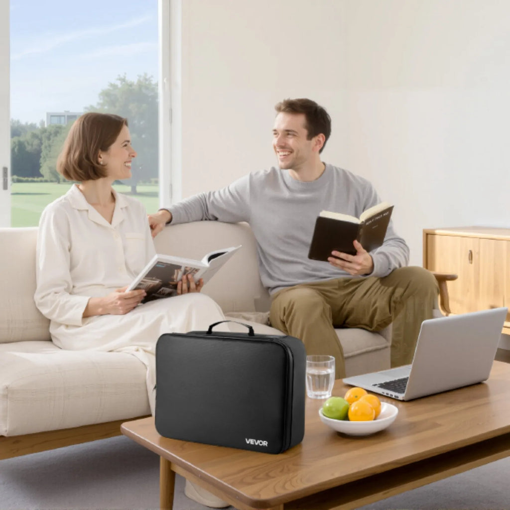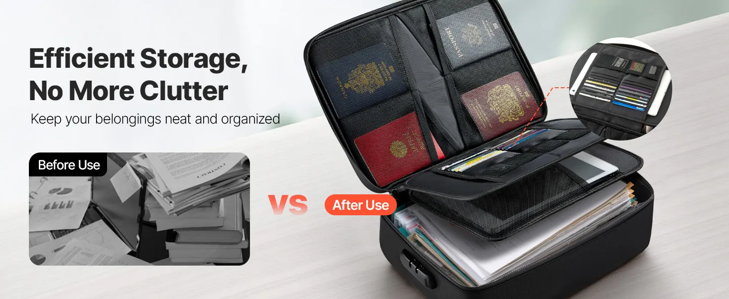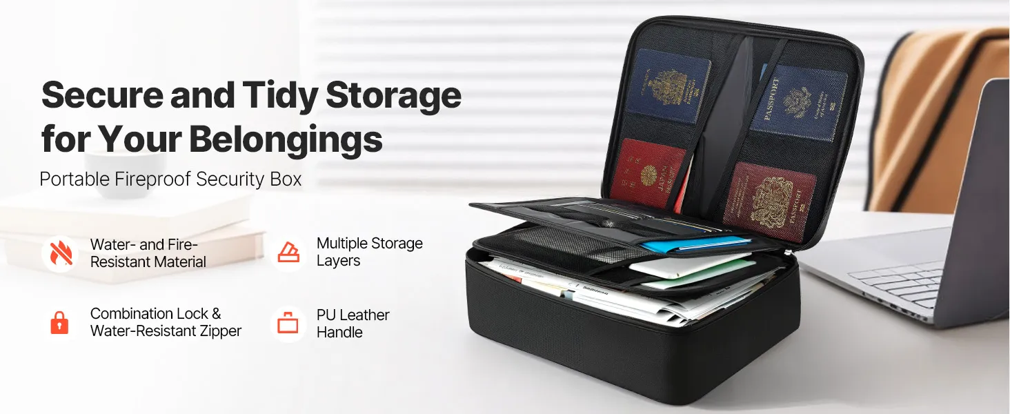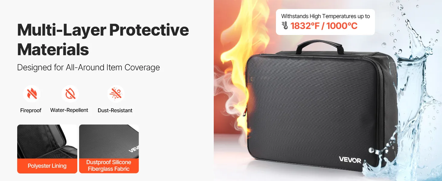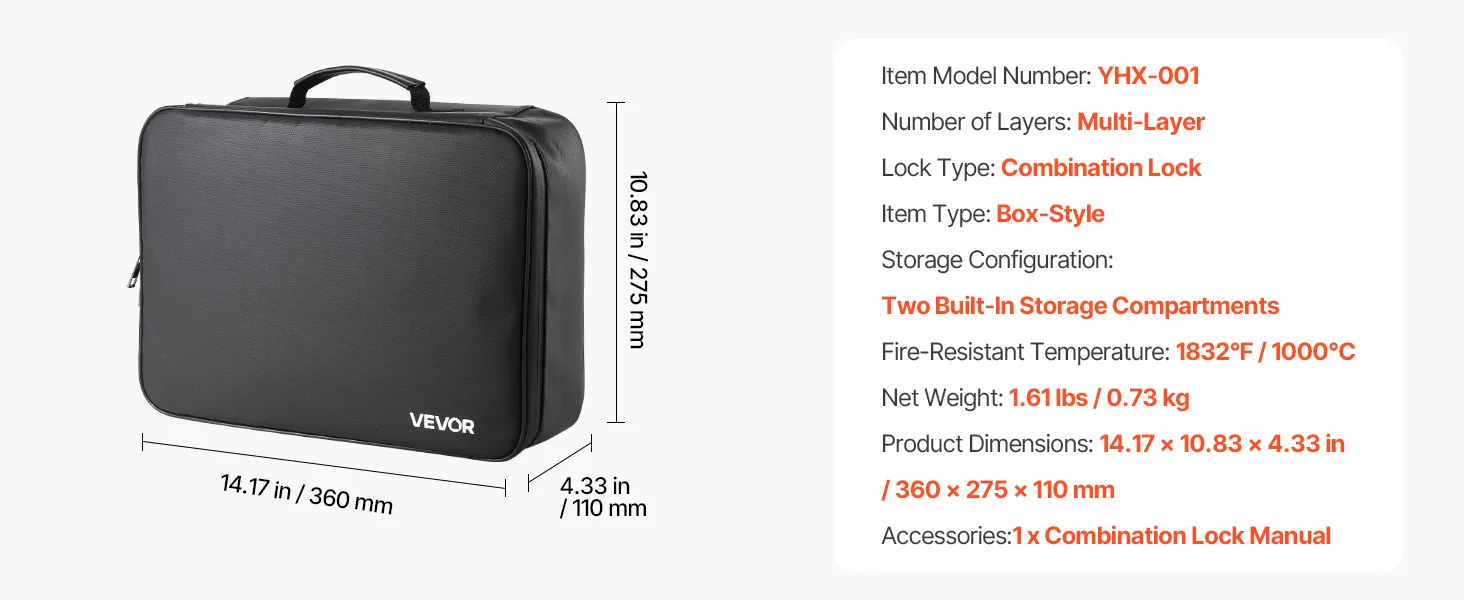 Šis pārnēsājamais ugunsdrošais seifs ir izgatavots no karstumizturīga materiāla, kas iztur līdz 1000 ℃, kā arī pasargā no ūdens un putekļiem. Ar svaru tikai 0,73 kg tas nodrošina vairāku slāņu uzglabāšanu dokumentiem un ierīcēm. Kombinācijas slēdzene un ūdensdrošais rāvējslēdzējs piešķir papildu drošību lietošanai mājās, birojā vai automašīnā.