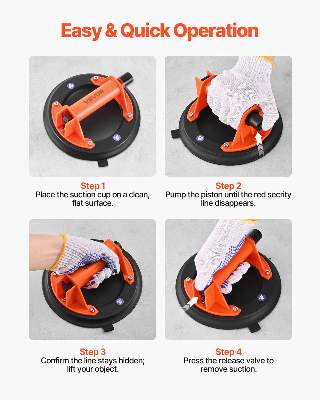 Novietojiet pacēlāju, nospiediet paliktni un pumpējiet, lai izveidotu vakuumu. Šim flīžu vakuuma pacēlājam nav nepieciešama sarežģīta uzstādīšana vai papildaprīkojums, tāpēc jauni vai retāk lietotāji var ātri sākt darbu un uzturēt projekta plūsmu.