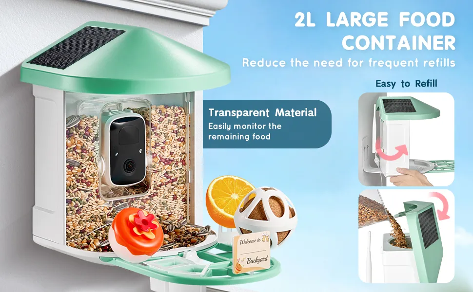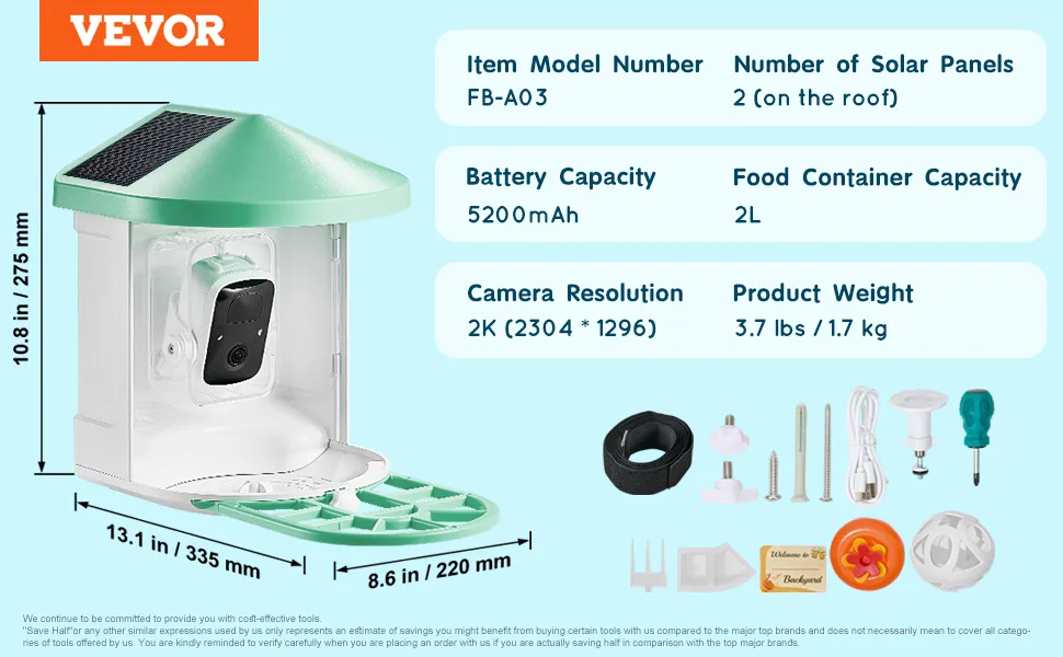 VEVOR viedā putnu barotava ar kameru, 2K HD izšķirtspēja, AI atpazīšana vairāk nekā 10 000 putnu sugām, saules enerģijas darbināma putnu vērošanas kamera ar automātisku uzņemšanu un tūlītējiem paziņojumiem, bezvadu āra lietošanai, ar 2 saules paneļiem