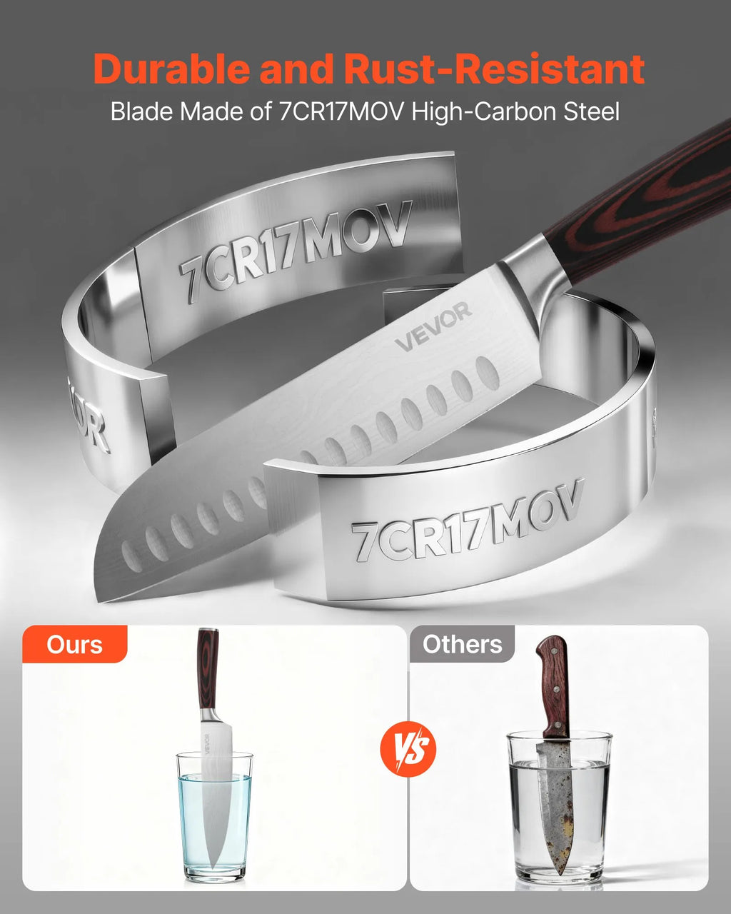 Izturīgi un noturīgi pret rūsu: Izgatavoti no 7CR17MOV augsta oglekļa nerūsējošā tērauda, naži nodrošina optimālu cietības un izturības līdzsvaru, novēršot šķelšanos vai plaisāšanu. Asmeņi ir eļļā rūdīti un pulēti, lai izturētu sāls miglas testus, nodrošinot noturību pret koroziju un ilgstošu asumu arī mitrā virtuves vidē.
