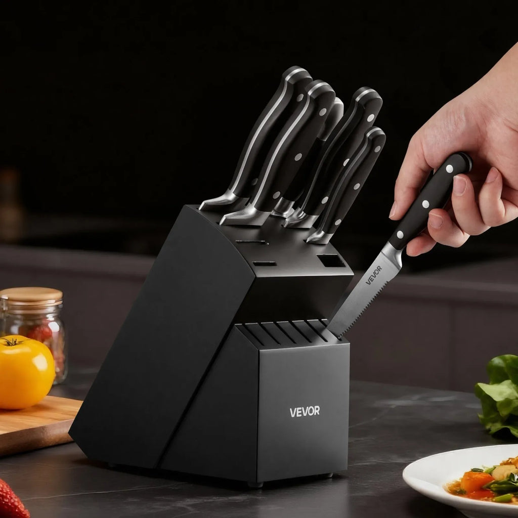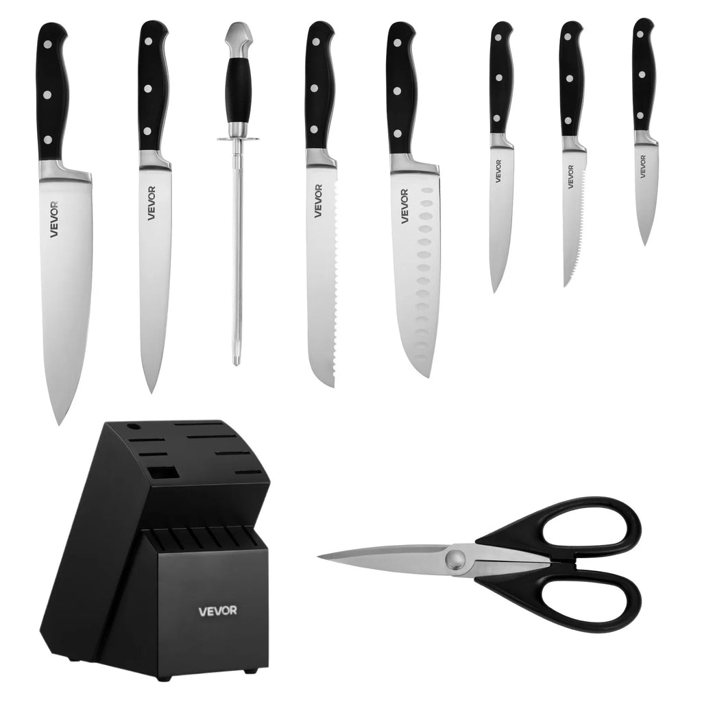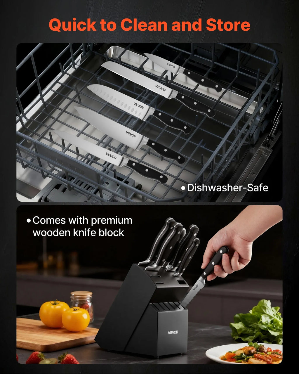 VEVOR virtuves nažu komplekts ar koka bloku un asinātāju, 15 daļas, asi augsta oglekļa nerūsējošā tērauda naži, virtuves piederumi ar plaisām izturīgiem rokturiem, asināmais stienis, paredzēts mājas pavāriem