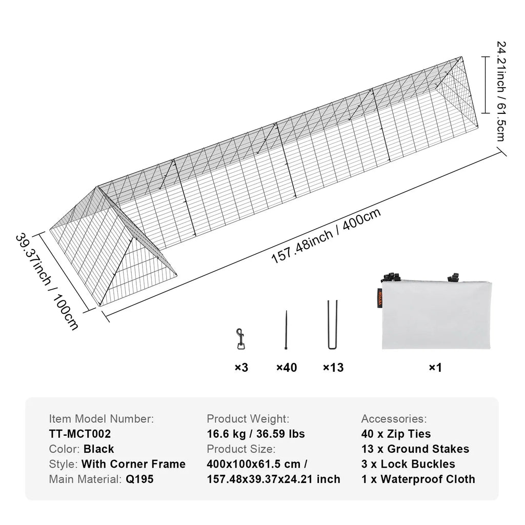 VEVOR vistas tuneļi, 400 × 100 × 61 cm (G × P × A) pārnēsājami āra tuneļi ar stūra rāmjiem, vistas pastaigu iežogojums, piemērots vistām, pīlēm un trušiem