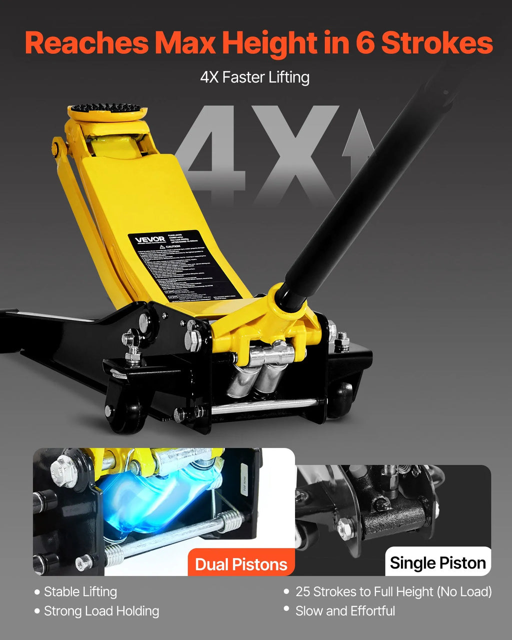 Divu virzuļu ātrās pacelšanas sistēma: Hidrauliskais grīdas domkrats izmanto divu virzuļu sistēmu, sasniedzot maksimālo augstumu tikai ar sešiem pumpieniem bez slodzes — 4 reizēs ātrāk nekā vienvirzuļu domkrati. Vienmērīga svara sadale un hermētisks sūknis nodrošina stabilu un ātru pacelšanu.