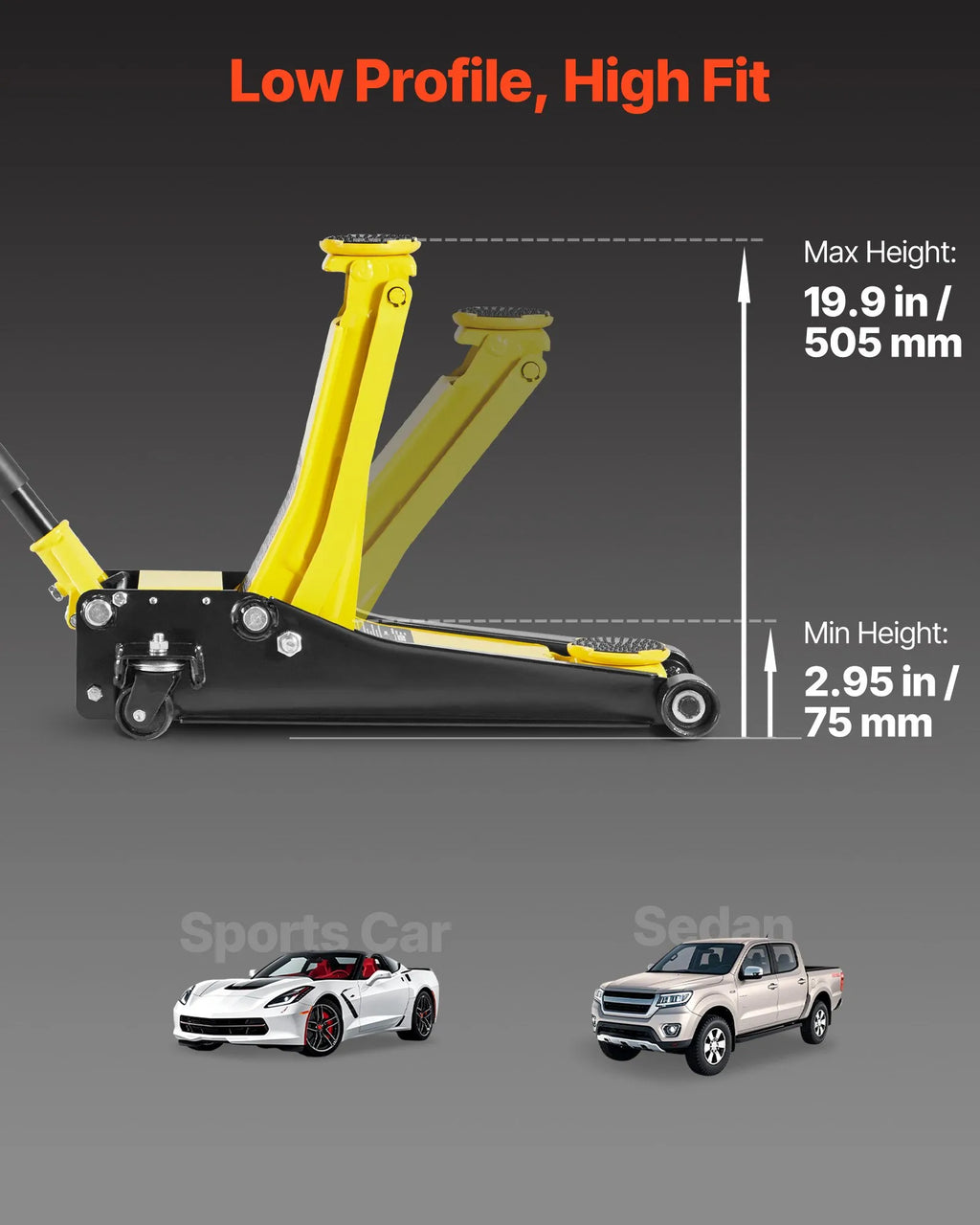 Pacelšanas diapazons: Zema profila grīdas domkrats paceļ no 75 līdz 505 mm (2,95–19,9 collas). Tas viegli iekļaujas zem automašīnām ar zemu klīrensu, piemēram, sporta automašīnām vai sedaniem, un vienlaikus nodrošina augstu pacelšanu. Lai paceltu, aizveriet izplūdes vārstu un pumpējiet; lai nolaistu, pagrieziet pagarināto rokturi pretēji pulksteņrādītāja virzienam, nodrošinot gludu nolaišanu.
