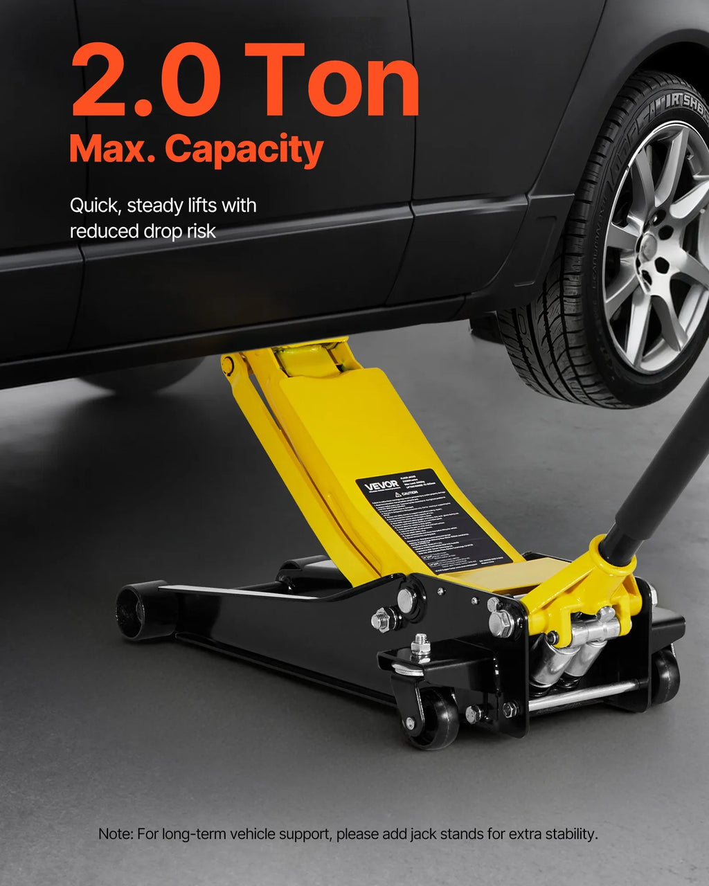 Maksimālā slodze 2 t: Domkrats atbalsta līdz 2 tonnām (4400 lbs), ideāli piemērots sporta automašīnām, sedaniem un kompaktajiem SUV. Piemērots mājas apkopes darbiem, riepu maiņai, bremžu pārbaudēm, izplūdes vai piekares darbiem. Papildu atbalstam lietojiet kopā ar statīviem.